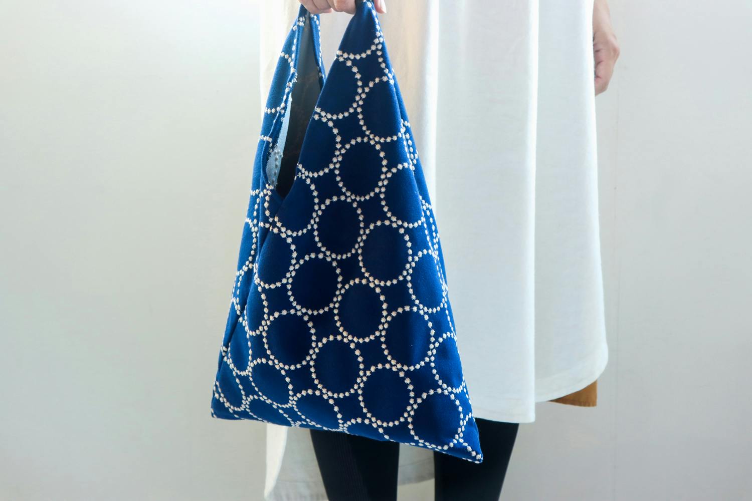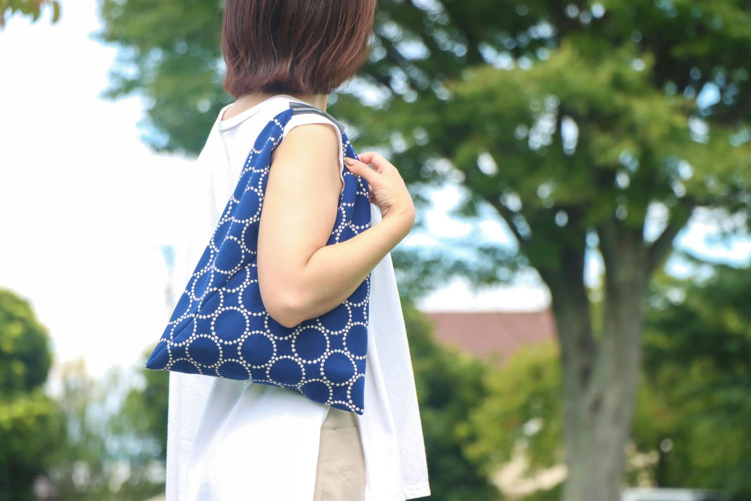 1枚の布から作られる「あずま袋」は、たいらにすると薄い2枚だけの布になるので、折りたたんで旅行バッグの中にもしまえます。大きなバッグにバッグインするにもおすすめです。