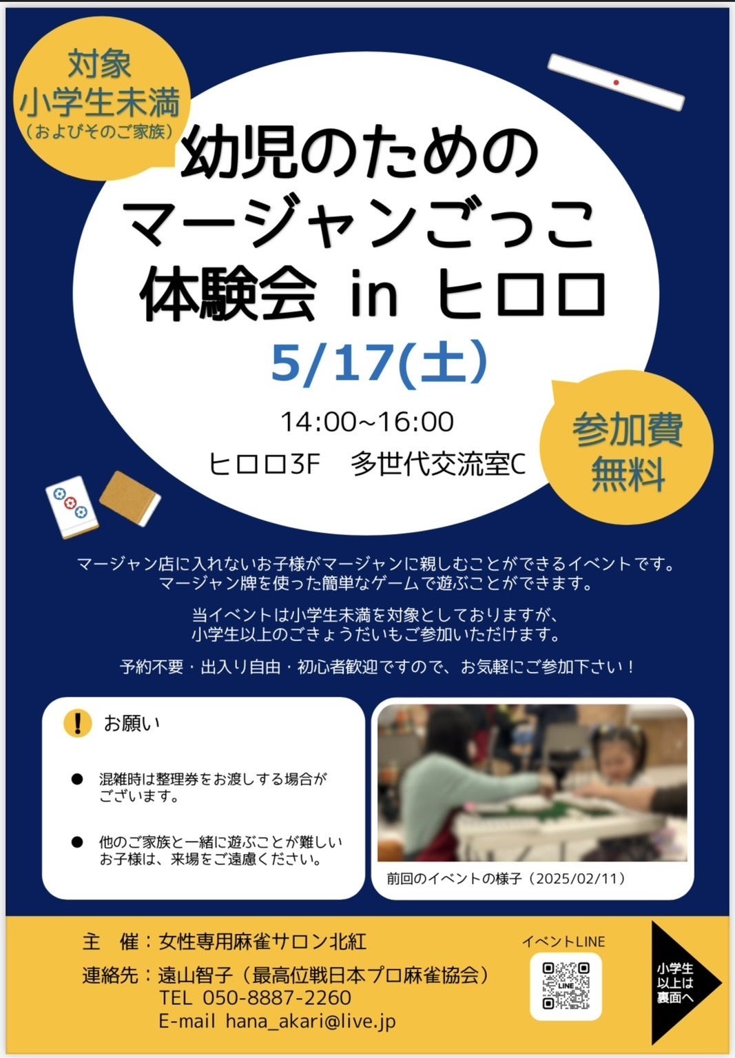 クラウドファンディングへのご支援、拡散のご協力、いつもありがとうございます!!おかげさまで、2回目の子供のための麻雀体験イベントを開催できることになりました。今回は、混雑を避けるために小学生未満対象、小学生以上対象の2回に分けて開催いたします。「幼児のためのマージャンごっこ体験会inヒロロ」2025年5月17日(土)14:00~16:00ヒロロ3階 多世代交流室C小学生未満のお子様と、そのご家族(小学生以上のごきょうだいも可)が対象となるイベントです。ご来場と、引き続きのご支援をよろしくお願いいたします!