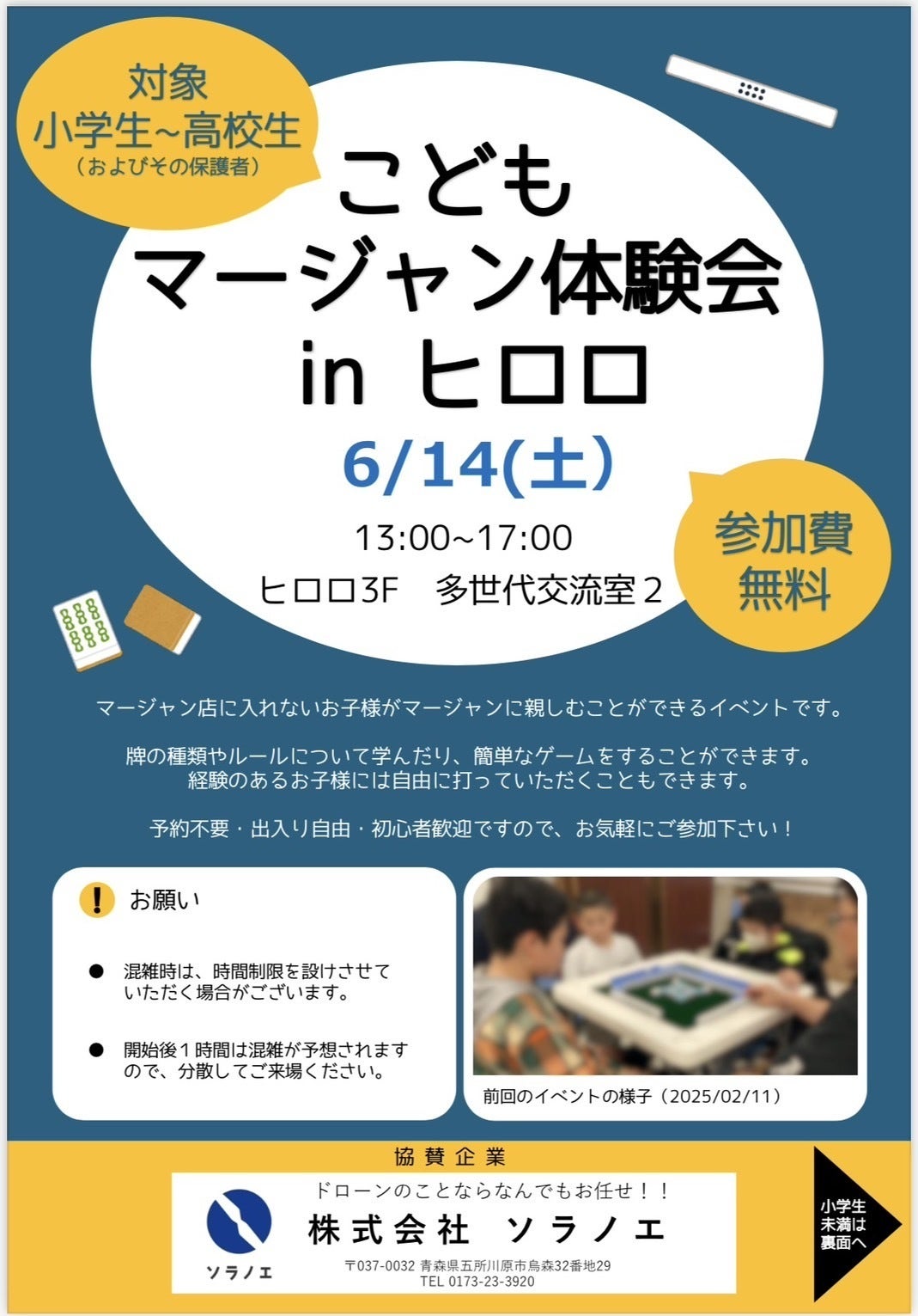 クラウドファンディングへのご支援、拡散のご協力、いつもありがとうございます!!おかげさまで、2回目の子供のための麻雀体験イベントを開催できることになりました。今回は、混雑を避けるために小学生未満対象、小学生以上対象の2回に分けて開催いたします。「こどもマージャン体験会inヒロロ」2025年6月14日(土)13:00~17:00ヒロロ3階 多世代交流室2小学生~高校生と、その保護者の方が対象となるイベントです。ご来場と、引き続きのご支援をよろしくお願いいたします!