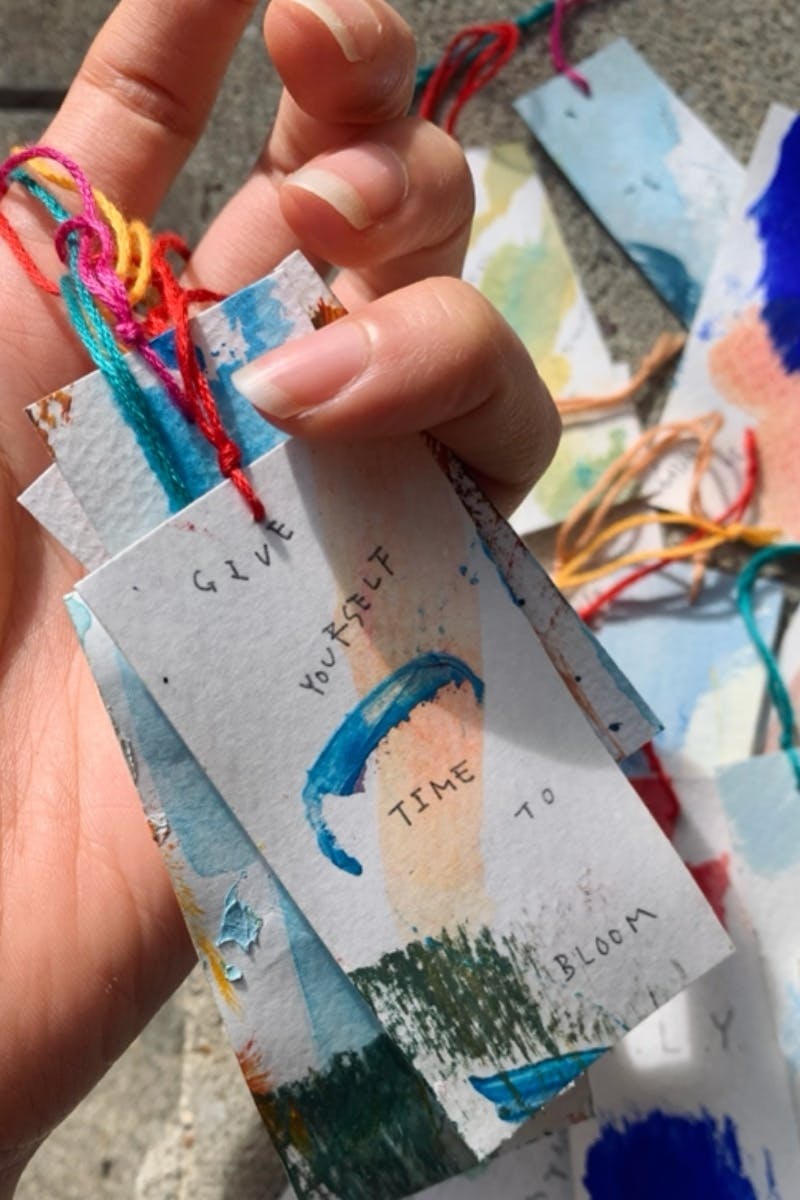 絵を描く際、余った塗料を紙の切れ端とかで拭うのですが、長年取っておいたそれにメッセージを加えて糸を通しました。