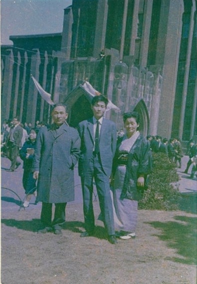 大学の卒業式、両親と