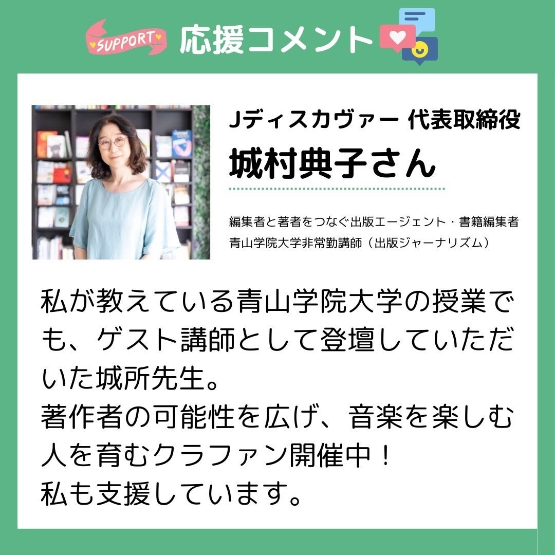 2025/03/24 12:48Jディスカヴァー代表取締役である城村典子さんから応援メッセージをいただきました!城村さんは、30年以上にわたり、書籍編集者として活躍されています。過去にクラウドファンディングに挑戦されて、目標の291%の寄付を集めるという功績を残されました。城所先生のクラファンも同じように、大成功を収めたいものです……!!城所先生とも交流が深く、昨年には城村さん主催のJディスカヴァー10周年フェスにも参加させていただきました!城村さん、メッセージありがとうございます!皆さまも、引き続き、応援よろしくお願いします!! もっと見る