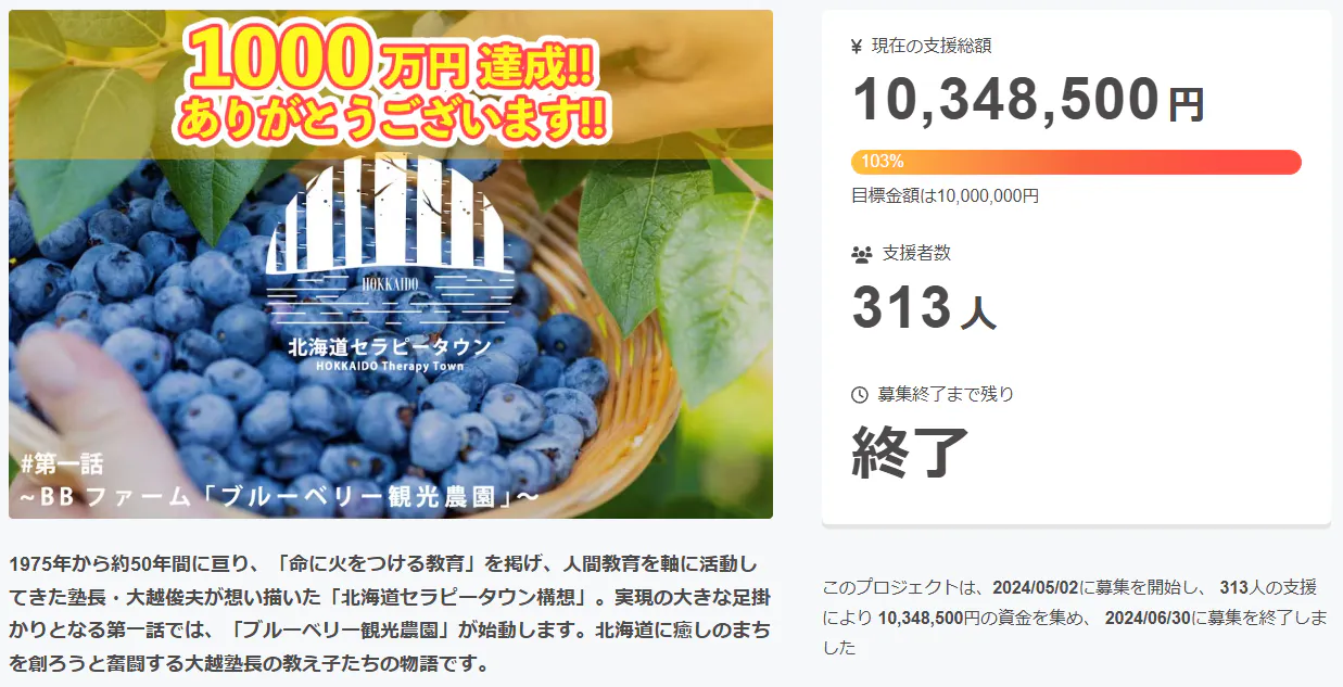 2023年3月1日~31日に実施した初めてのクラウドファンディング( 詳細はこちら )を経て、第一話としてBB Farm「ブルーベリー観光農園」を開園するためのクラウドファンディングを2024年5月2日~6月30日まで実施しました。結果は支援者313人、目標金額である1000万円に対し、1000万円を超える多くの支援をいただくことができました。大変大きな反響をいただき、多くの皆様に応援していただき、感謝申し上げます。