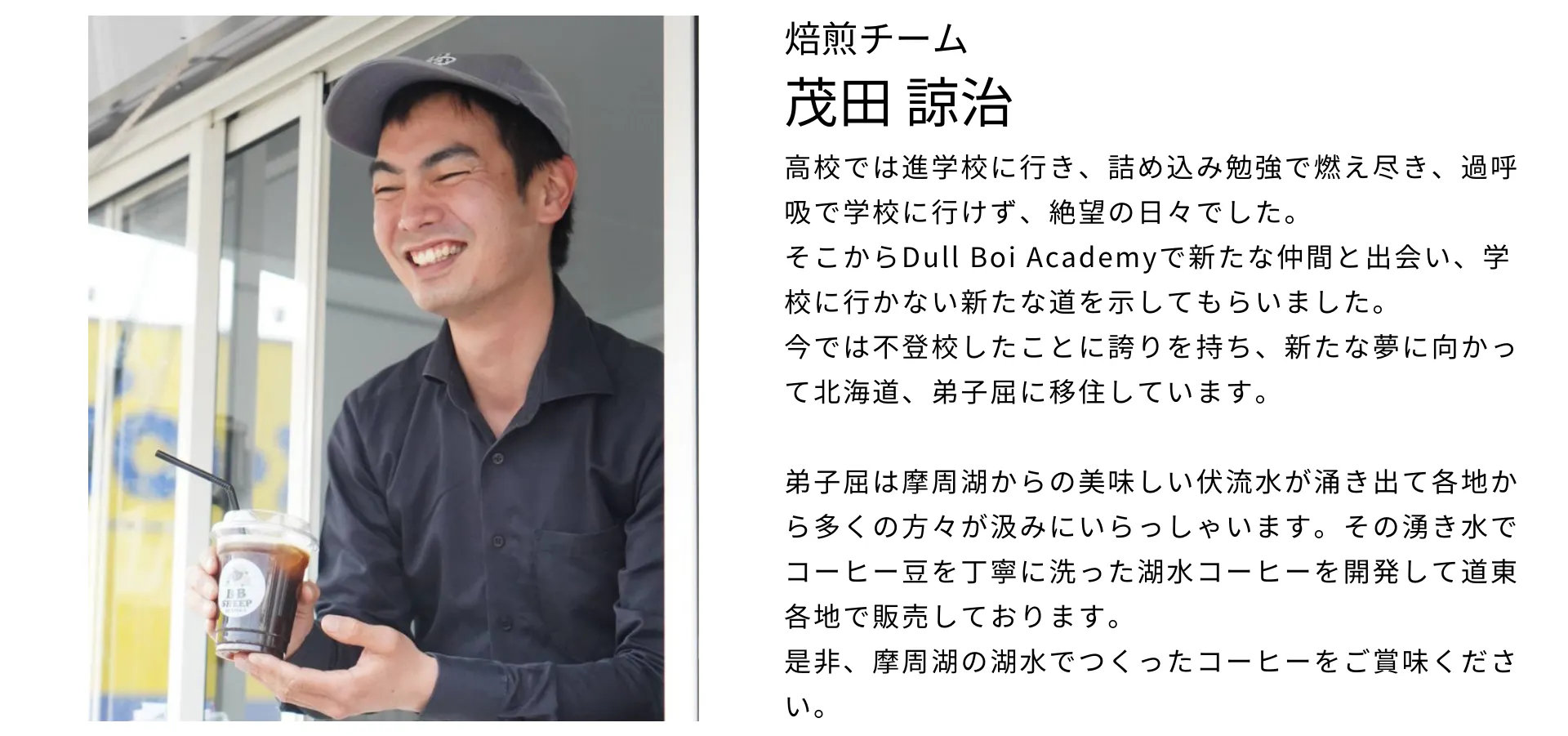 焙煎前の生豆を摩周湖の湧水を使って丁寧に洗うことで湧水が生豆に浸透。豆の持つ雑味やエグミが取れ、スッキリとしたクリアな後味をつくり出すことに成功。弟子屈町でしか作れない、手間暇かけて自家焙煎した神秘的なコーヒーが出来上がりました。