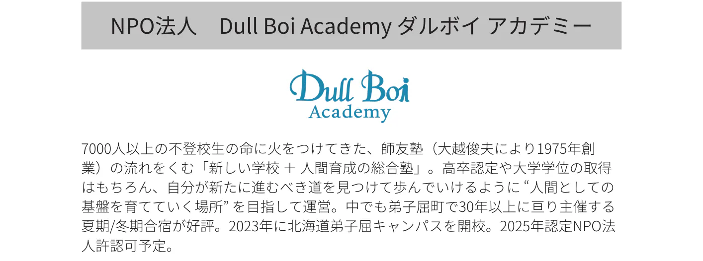 改めまして、私たちは、今の教育システムに合わない若者をそのまま受け入れるために「人間育成の総合塾」として設立した私塾「Dull Boi Academy(ダルボイ・アカデミー)」です。
