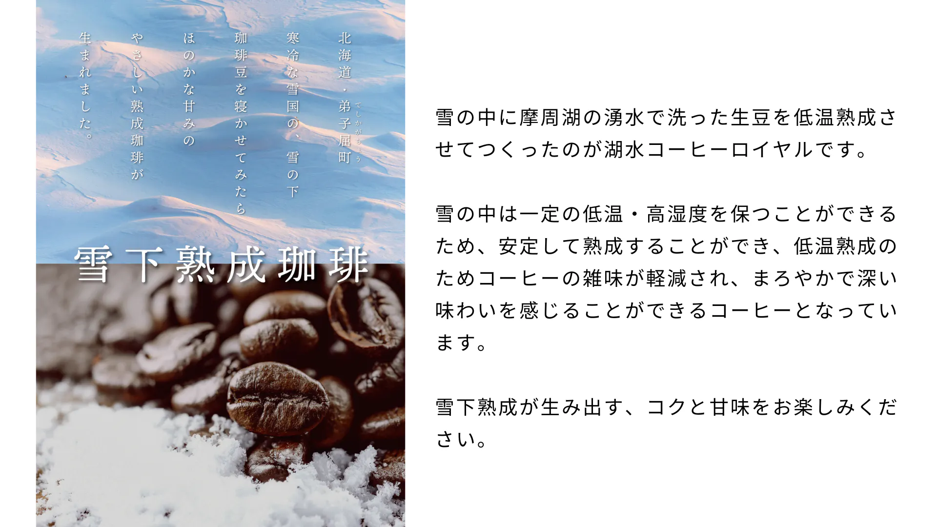 この「発酵」と「熟成」の専門家である小泉先生監修のもと、「湖水コーヒーロイヤル(雪下熟成珈琲)」を開発、熟成の現場も見ていただきながら試行錯誤し、商品化にこぎつけることができました。