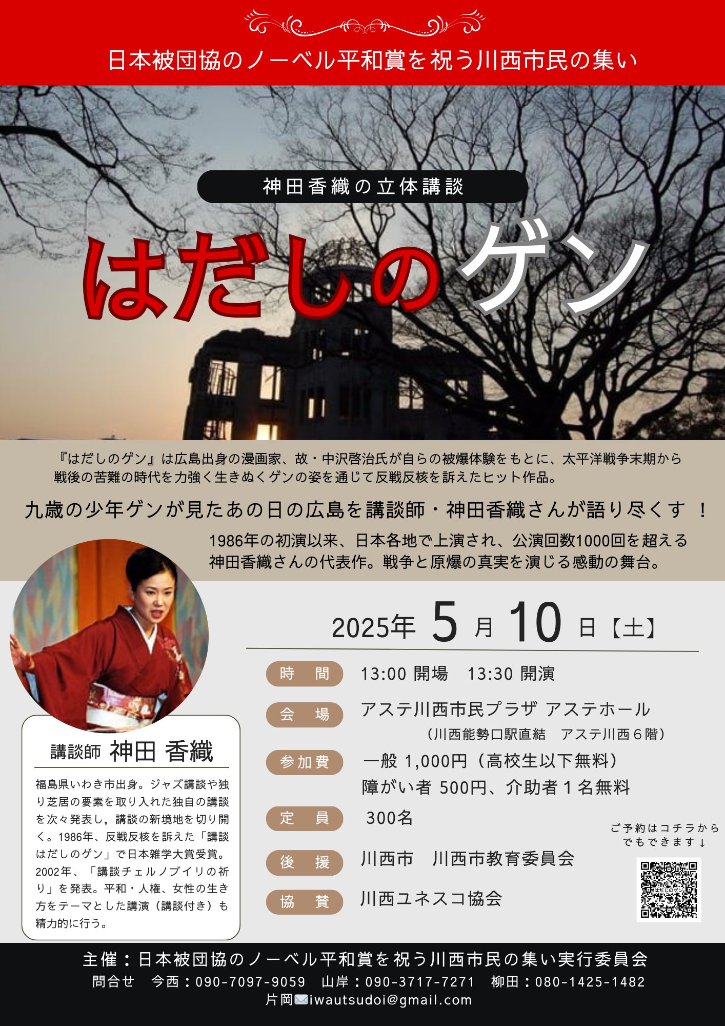 原爆の記憶を風化させない!「日本被団協のノーベル平和賞を祝う川西市民の集い」の開催。講談師・神田香織さんによる「講談はだしのゲン」の上演です!