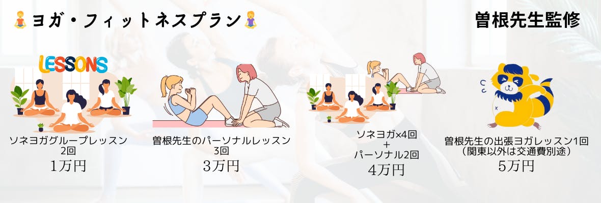 ・ヨガ・フィットネスプラン・・・心も身体も整えたい方へ…!曽根先生が丁寧に、時に厳しく指導してくれます。こちらもプレゼント用でのご支援も可能です。