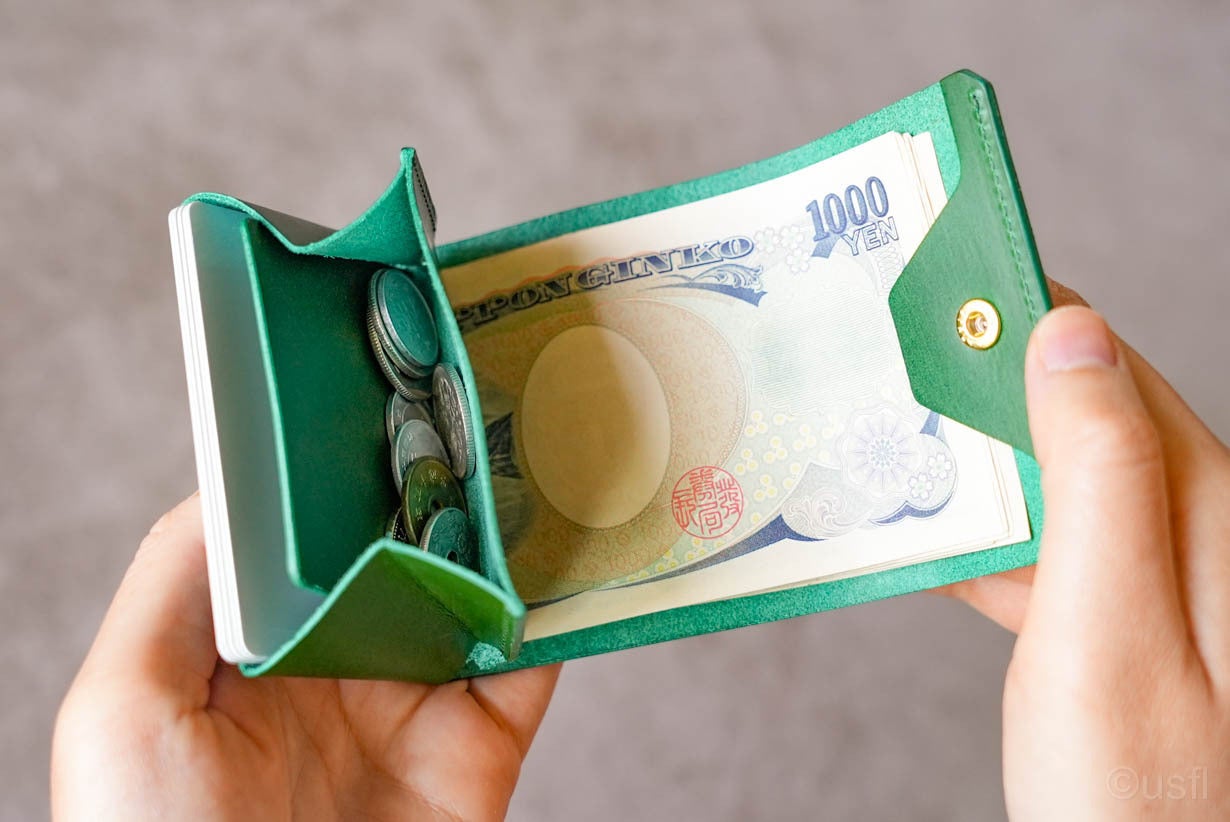 mini Sでは必要ありません。開くだけで、カード、小銭、お札のすべてが見えて、取り出せるポジションになります。