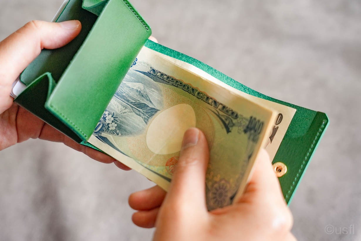 これまでのコンパクト財布は、お札の収納も大変でした。お札を折り畳んでから収納したり、財布を傾けたり、お札の収納スペースを開く必要があったからです。手間がかかり、複雑な操作を求められていました。mini Sは差し込むだけです。お札の収納スペースは、一手間かけて、なめらかに磨いています。毛羽立ちを抑えることで、スムーズに差し込めます。