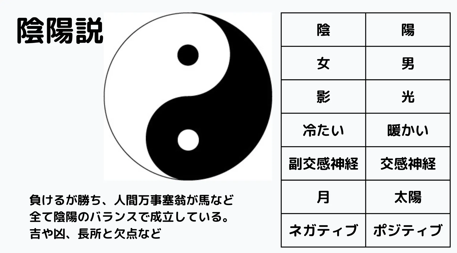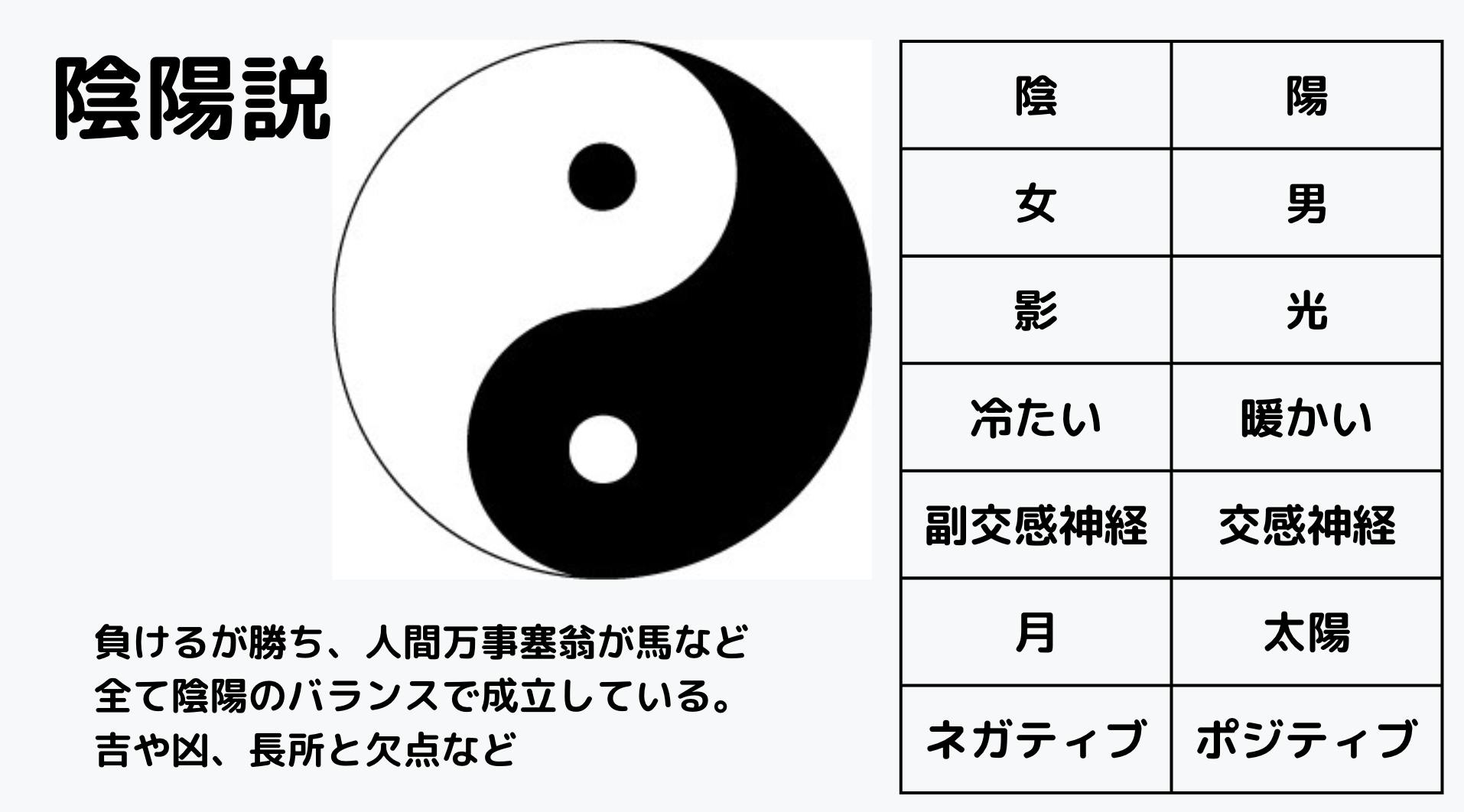 この世の森羅万象は全て陰と陽から成り立つ、この考え方が陰陽説になります。陰と陽の組み合わせで成り立つ、またはそのバランスで成立すると考えても良いでしょう。陰と陽の性質は真逆なため対立軸ともなり、男と女、光と影、温暖と寒冷などがそれぞれ陽と陰に区別されるわけです。男性を陽、女性を陰とし、この世に生きる全ての人はこの陰陽の交わりから生じてくるという考えも重要です。また太陽が昇っては沈み、潮が満ちては引き、呼吸も吸って吐いての繰り返しです。陰陽は繰り返すものであることも大事な視点です。単なる対立だけではなく交わり、そしてバランスをとりつつ繰り返していくことも理解してみましょう。いわゆる吉と凶と呼ばれるものも同じです。また自分の中の短所や長所も同じと言えるでしょう。人間も人間関係もネガティブな面と同じだけポジティブな面が存在する、そしてそれは循環することをぜひ感じ取ってみてください。負けるが勝ち、止まない雨はない、なども同じことを表しているのでしょうね。