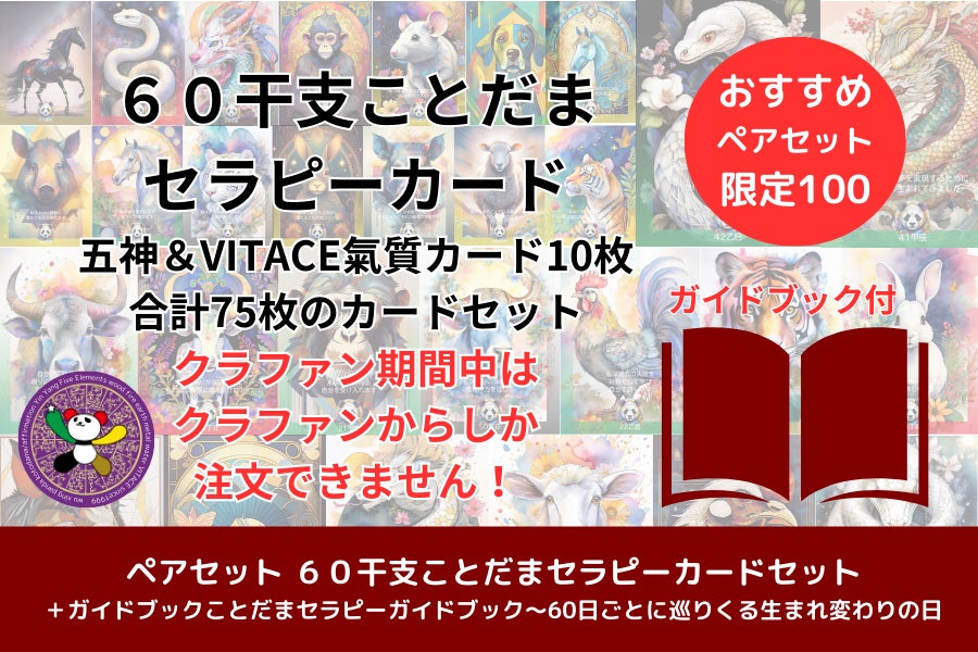 あなたらしく輝く人生を引き寄せる〜60干支ことだまセラピーカードとガイドブックのセット。このクラウドファンディングでしか手に入らない、先行販売の特別なセットです。*クラウドファンディング終了一定期間後は一般販売を予定しております