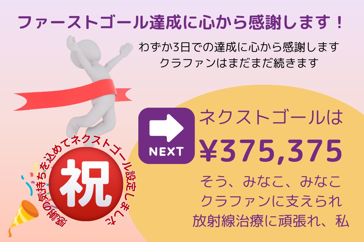また私にとってクラファンのスケジュール中は、乳がんの治療スケジュール、放射線治療や抗がん剤治療と並行したものになっています。クラファンで支援いただくことを治療に立ち向かう力にも変えていきたいと思っています。