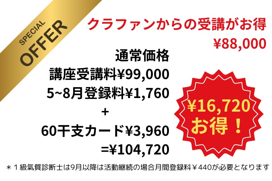 実際は受講料+月間登録料¥440の4ヶ月分=¥1,760+60干支ことだまセラピーカードセット¥3,960の合計で¥104,720が ¥88,000なんです!だから¥16,720お得!さすが巳年!