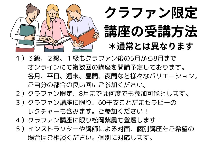 また、通常1級氣質診断士には動画学習は付属していませんが授業の参加が難しい方もおられると思いますのでクラファン受講生限定で動画学習もご用意します。