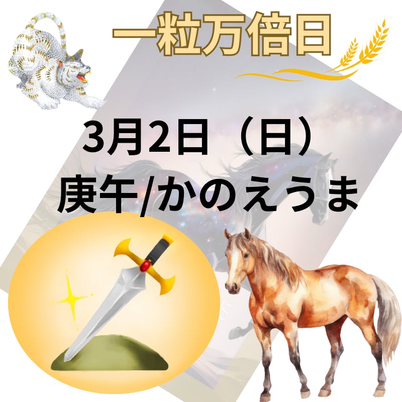 おはようございます!3月2日今日は一粒万倍日ですね一粒万倍日も宝くじ売り場などで掲示されてちょっと有名になってきましたがその意味は。。。一粒万倍日(いちりゅうまんばいび)とは、日本の暦における吉日の一つで、「一粒の籾(もみ)が万倍にも実り、立派な稲穂になる」という意味があります。わずかな行動が万倍にもなって返ってくるといわれ、何かを始めるのに最適な日とされています。借金などの悪いことも膨らんでいくとも言われています。ご用心を!そして今日は60干支では庚午の日です!庚は金の男性氣質または陽の氣質「剣」、そして十二支では午の日なんですね基本氣質が剣の人は 好奇心いっぱいでチャレンジ精神もあり、自分の人生を切り開いていく強さを持ち合わせています。パワフルな人生を個性豊かに生き抜く人です。 個が強く扱いにくい人という印象を与えがちです。相手を論破し一刀両断してしまう傾向が強く、自分の感情のコントロールが成功の秘訣になるでしょう。 個性やセンスを活かせて、真面目で正義感溢れる職業、ポジションに就くことも成功の鍵です。そして午の日生まれの人の特徴は物事を深く考えず小事に捕らわれ大事を逃す。熱しやすく冷めやすい。では庚午生まれの人の特徴は。。。。*こちらは支援者限定公開の記事でご案内しますね!*支援者限定公開の記事では60干支ことだまセラピーカードの全画像が毎日1枚づつ公開されています。カードが届くまでワクワクしながらお楽しみくださいね基本氣質や氣質診断ってなんだろうと思った方は風水ライフデザインスクール公式HPへ自分の基本氣質が知りたくなった方は こちらのページで生年月日を入れるとわかりますそもそも氣質診断って何?と思った方は無料ダウンロード小冊子「自分の取扱説明書〜氣質診断のすすめ」を読んでくださいね!