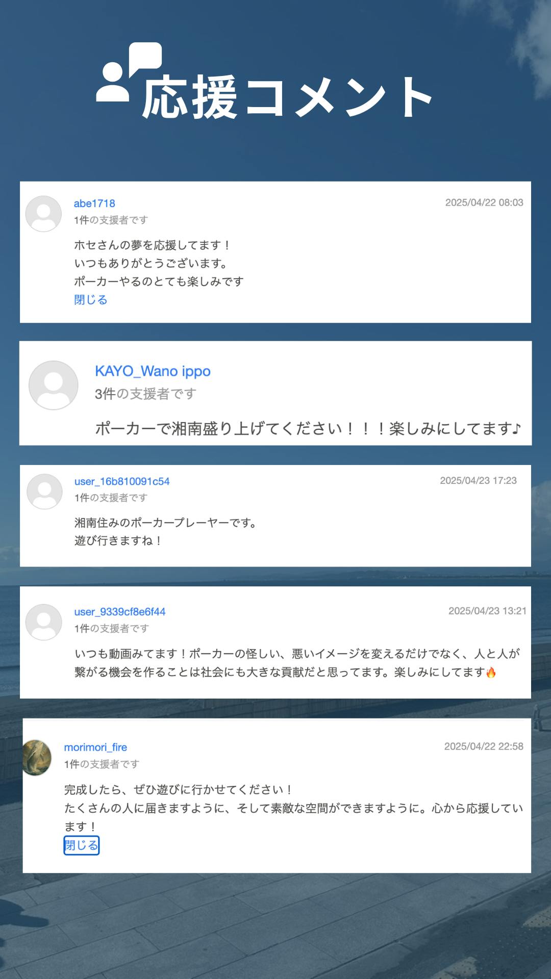 「ホセさんの夢を応援してます!」「湘南をポーカーで盛り上げてください!!」「ポーカーのイメージを変えてくれる活動に共感しています」