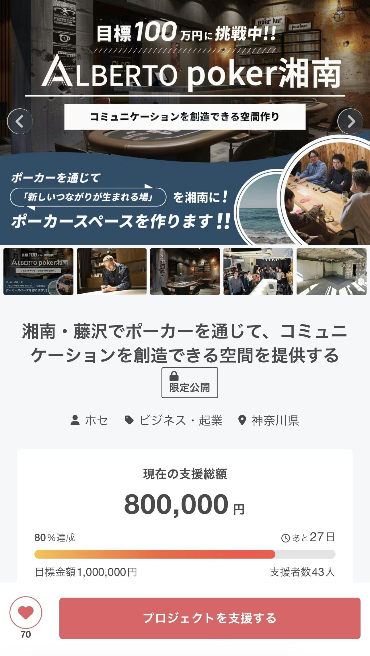 クラウドファンディングの目標である100万円まで残り20%です!