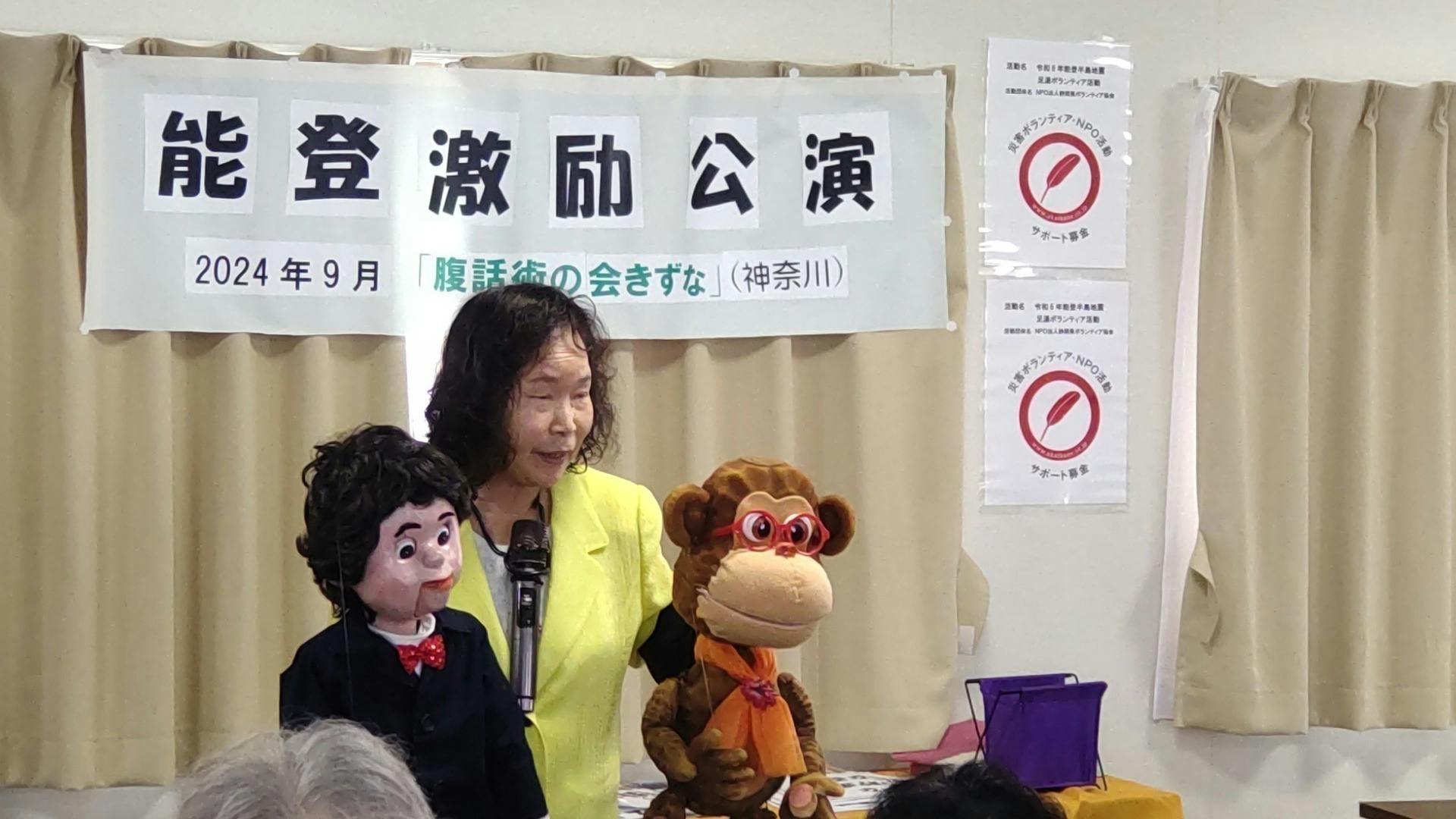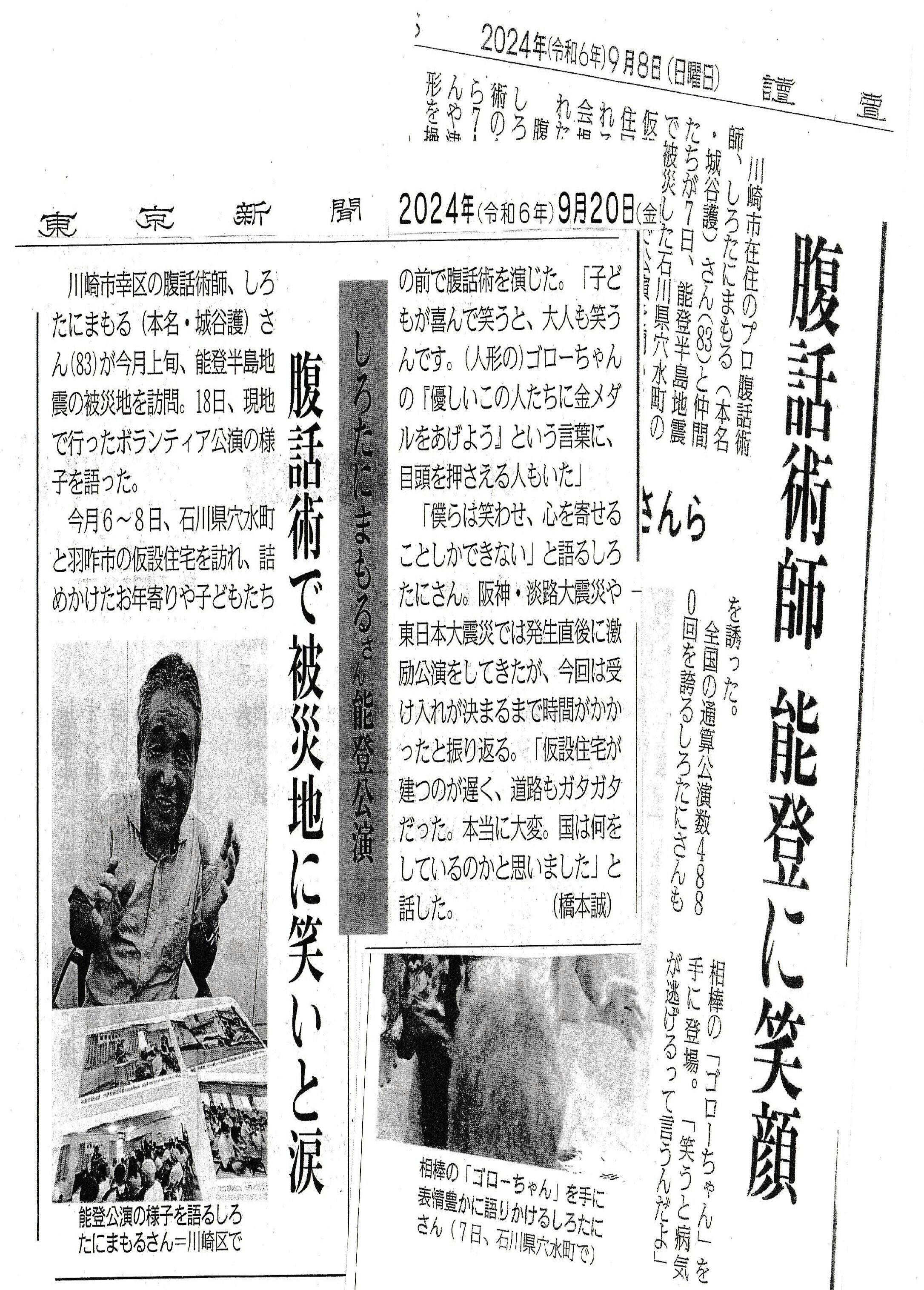 昨年9月、腹話術の会きずなは能登半島激励のボランティア公演をしました。この公演の様子は読売新聞と東京新聞で報道されました。読売新聞では、「住民ら50人がユーモアあふれる語りに引き込まれ、会場は拍手と笑いに包まれた。」、「仮設住宅に娘と暮らす大江夏子さん(75)は『久しぶりに思い切り笑って泣いた』と話した」といった内容が写真入りで報じられました。東京新聞では、仮設住宅でのボランティア公演が大変喜ばれたといった内容が写真入りで報道されました。