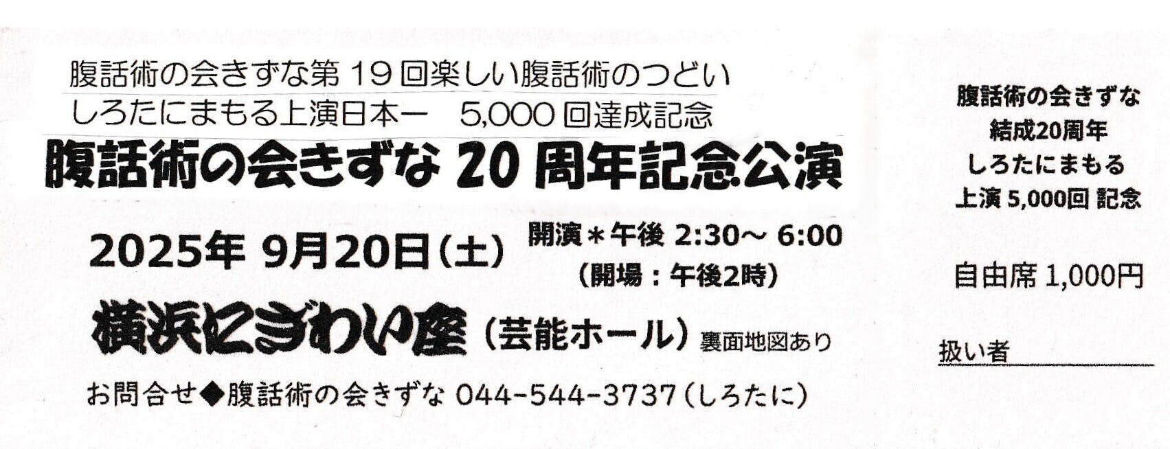 ②腹話術の会きずな20周年記念・しろたにまもる上演5,000回記念公演チケット(支援者限定の特別席をご用意:2025年9月20日(土)午後2:30~6:00 横浜にぎわい座)ご来場が難しい方には特別動画を配信