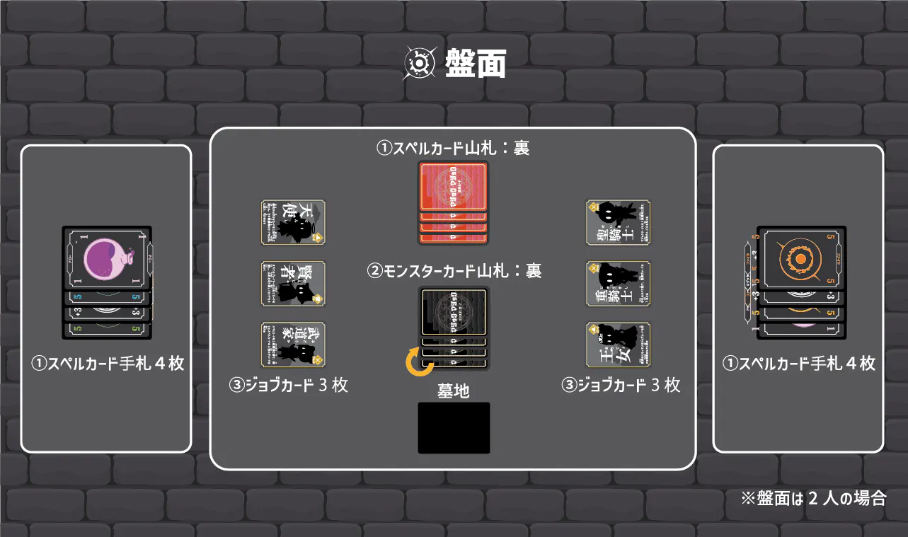 ①スペルカード(マジック、マジックサークル、ドロー)をシャッフルして山札とします。各プレイヤーは4枚ずつカードを引き、相手プレイヤーに見えないようにキープします。