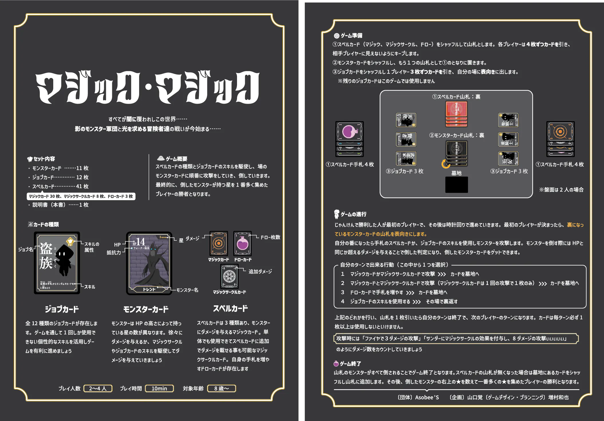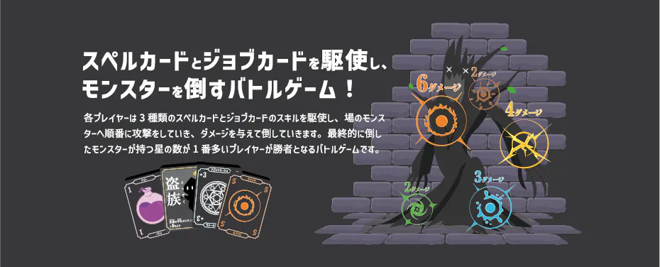 各プレイヤーは3種類のスペルカードとジョブカードのスキルを駆使し、場のモンスターへ順番に攻撃をしていき、ダメージを与えて倒していきます。最終的に倒したモンスターが持つ星の数が1番多いプレイヤーが勝者となるバトルゲームです。