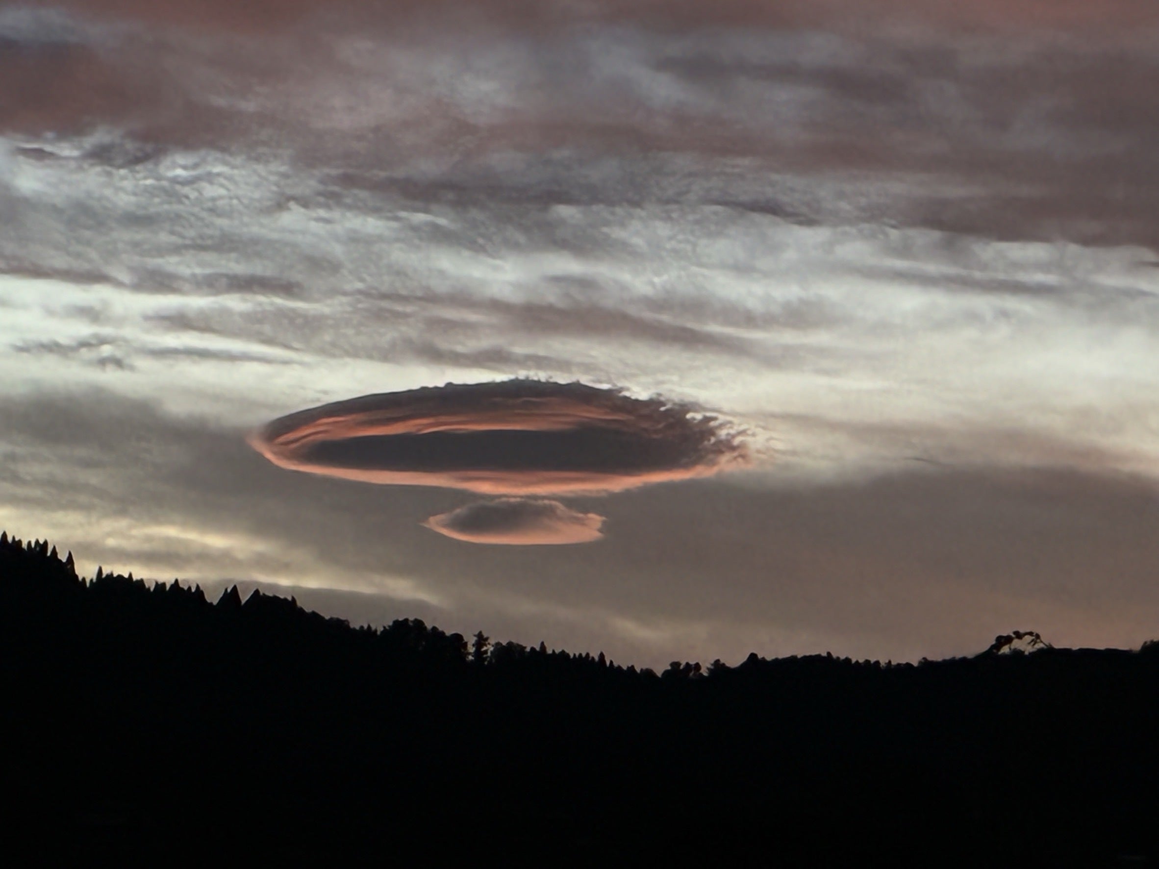 トプ画の綺麗な夕焼けが静まると、母船型の雲が出てきて、神秘的な空に。その後20時くらいからホタル達が光だします。
