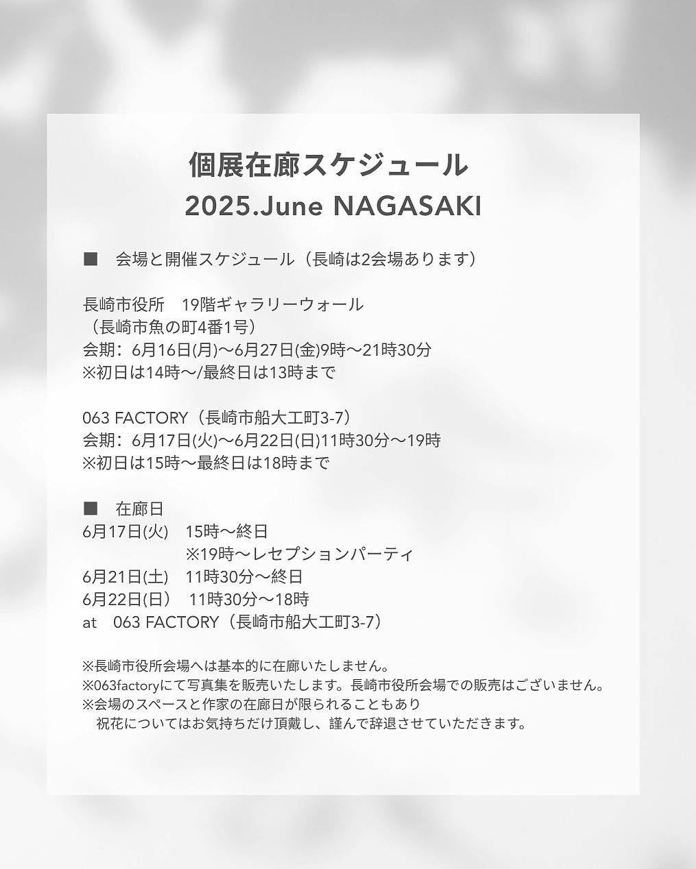 ※会場のスペースと作家の在廊日が限られることもあり祝花についてはお気持ちだけ頂戴し、謹んで辞退させていただきます。