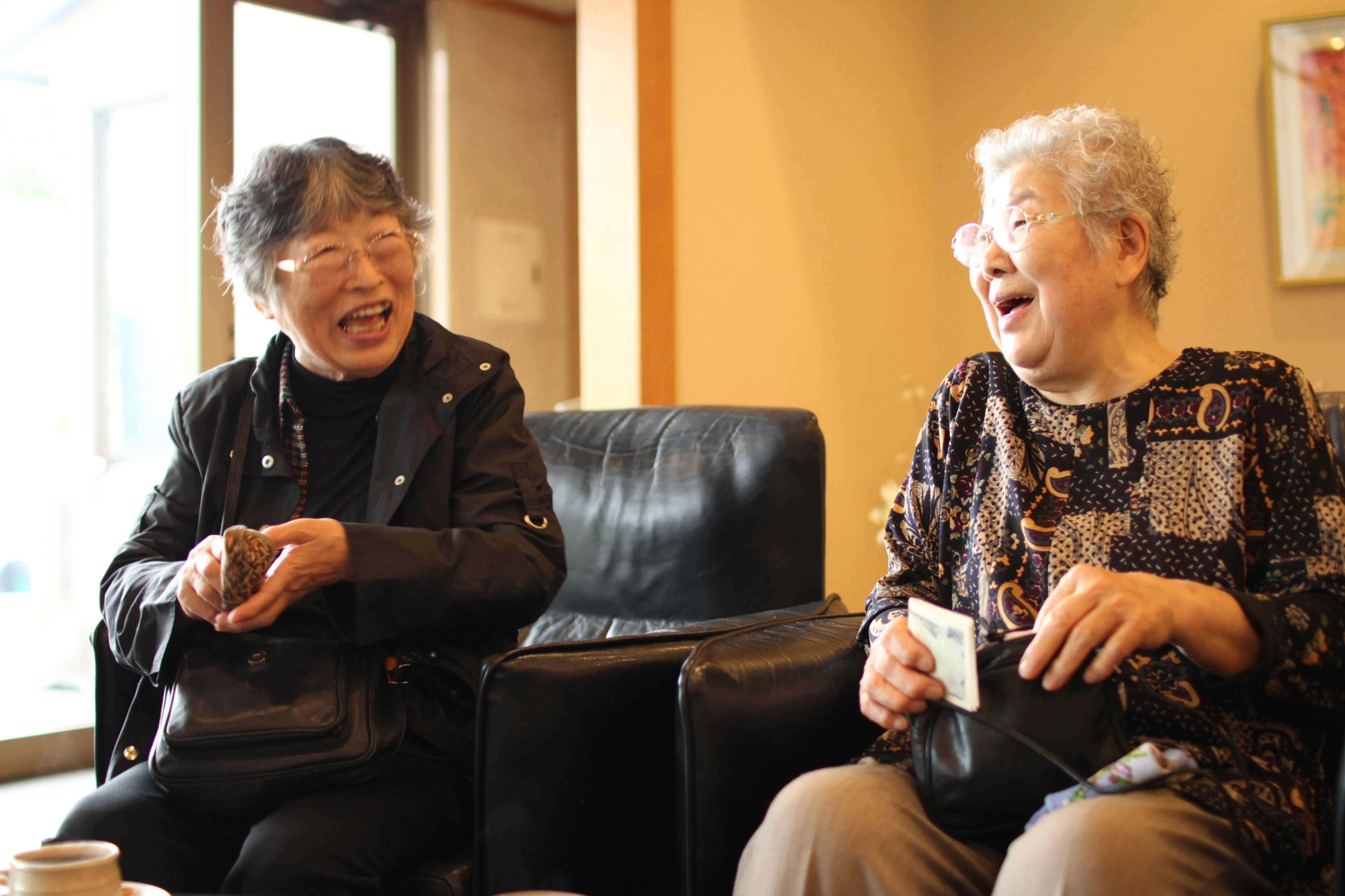 映っているのはいずれも、友人とのおしゃべりを楽しんだり、食事をしたり、街中を散策したりと、言わば「普通」の、日常の姿です。「爆心地から、世田谷」より。19歳の時に長崎で被爆した澤畑さん(写真右)は今年99歳になられます。