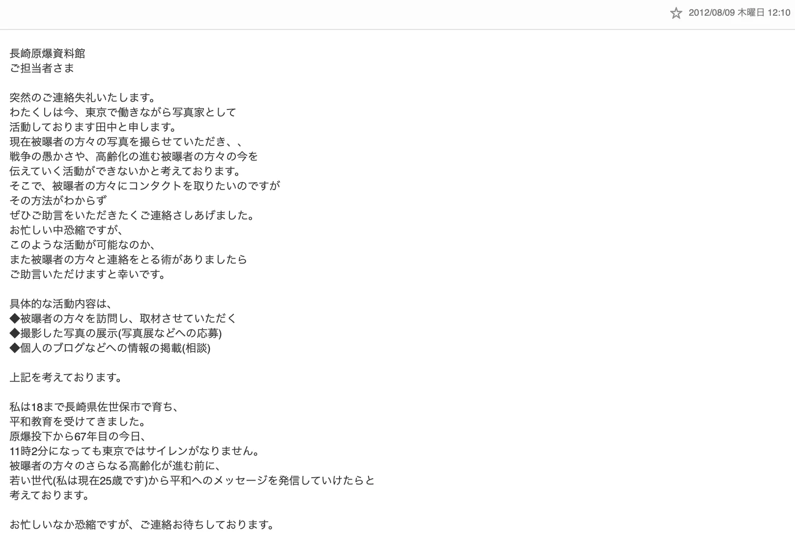 tanamaが2012年8月9日に原爆資料館宛に送ったメール(原文ママ)