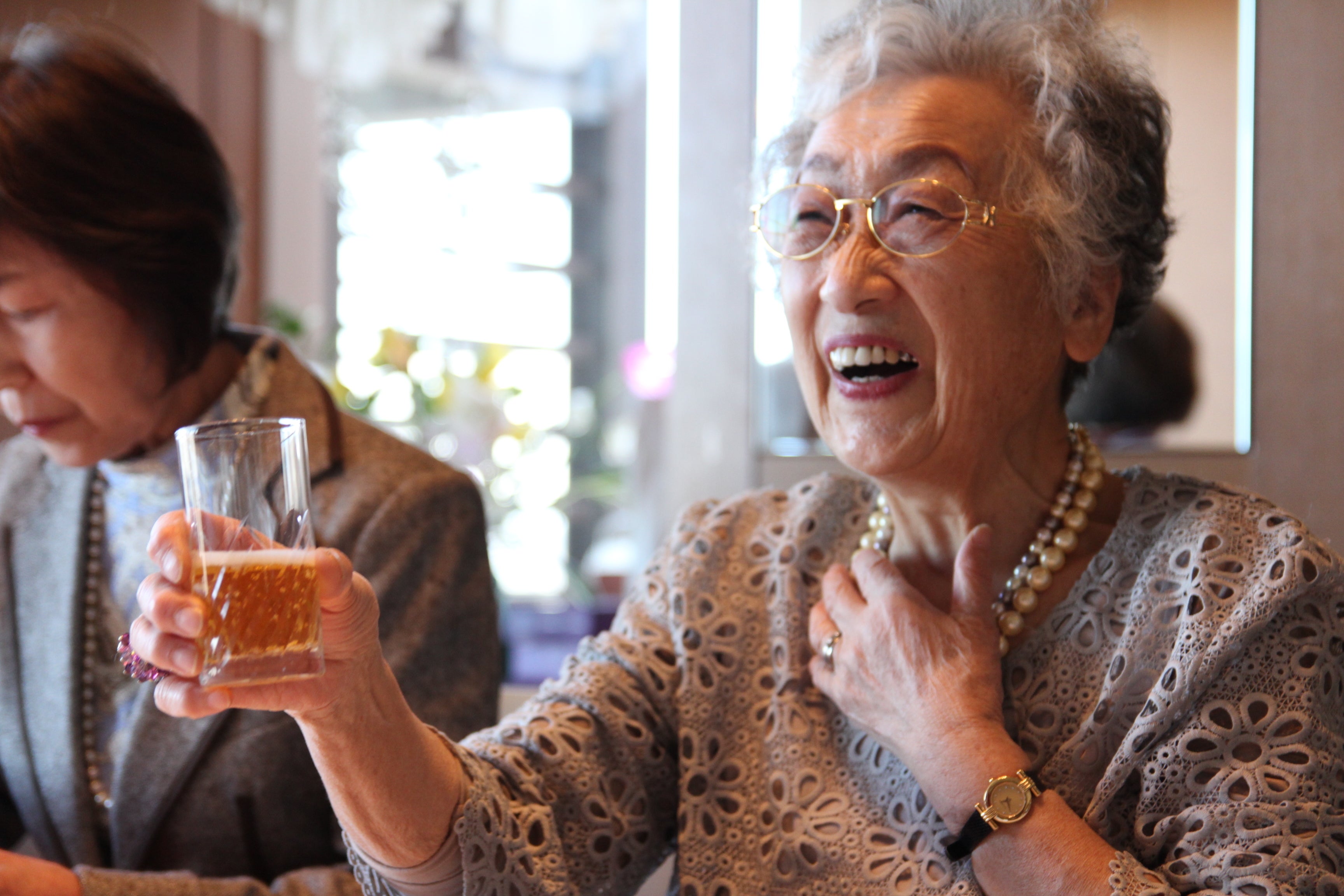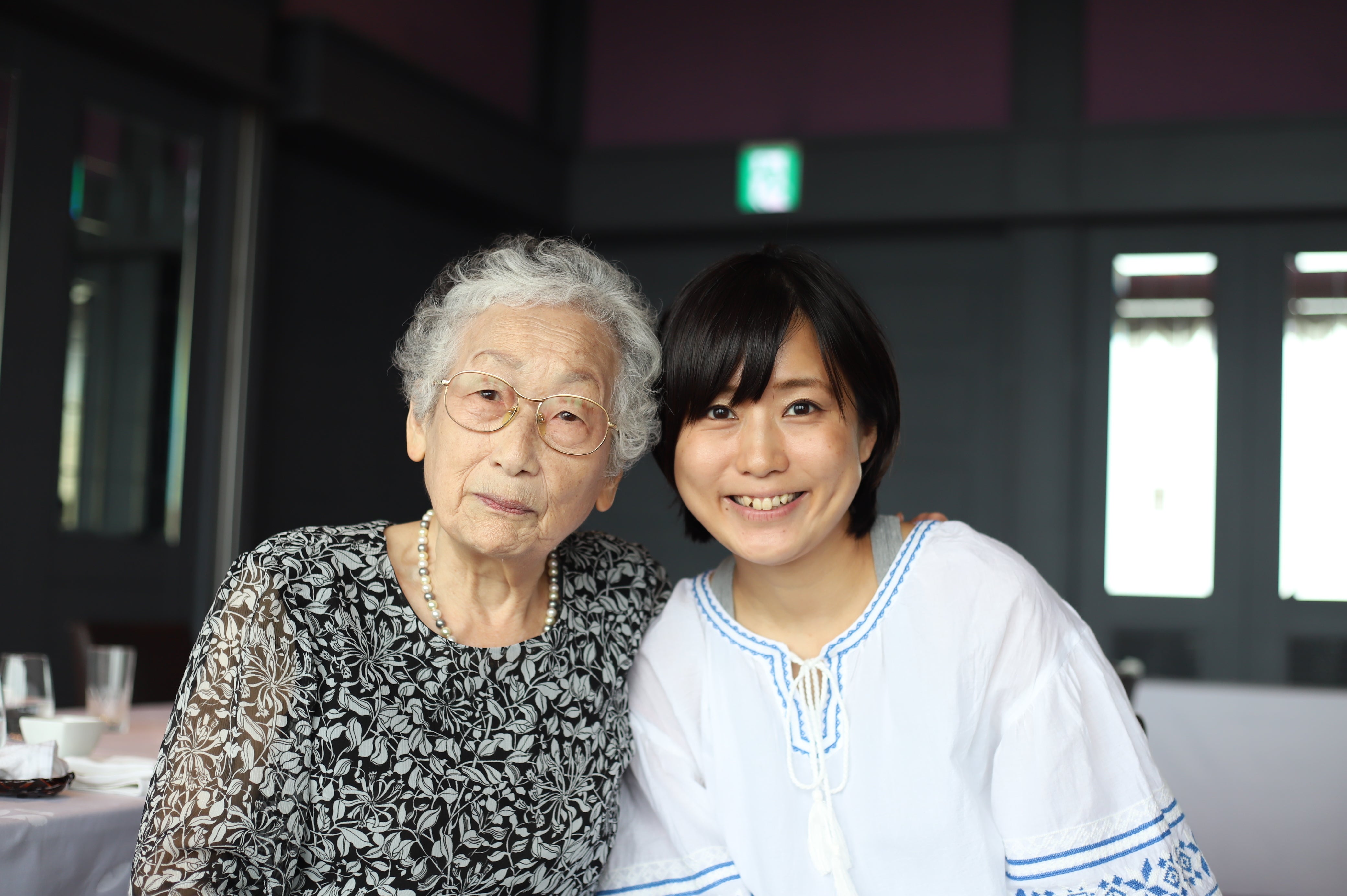 映っているのはいずれも、友人とのおしゃべりを楽しんだり、食事をしたり、街中を散策したりと、言わば「普通」の、日常の姿です。「爆心地から、世田谷」より。19歳の時に長崎で被爆した澤畑さん(写真右)は今年99歳になられます。
