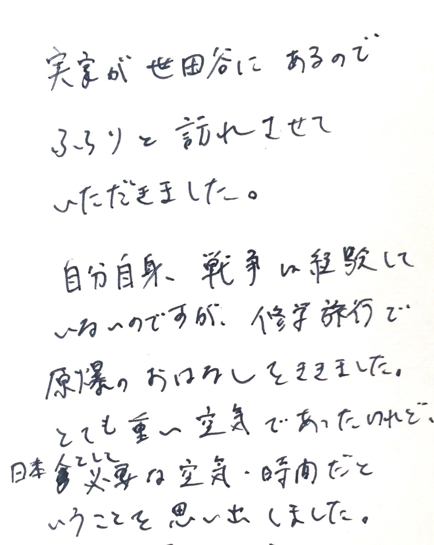 東京をはじめとする県外の地域では、「原爆」や「被爆者」がどこか他人事として考えられていること、社会の教科書で見かけた数行の史実くらいにしかとらえられていないことを知り、愕然としました。※もちろん、自治体や学校などが積極的に平和教育に取り組んでいる地域もあります。