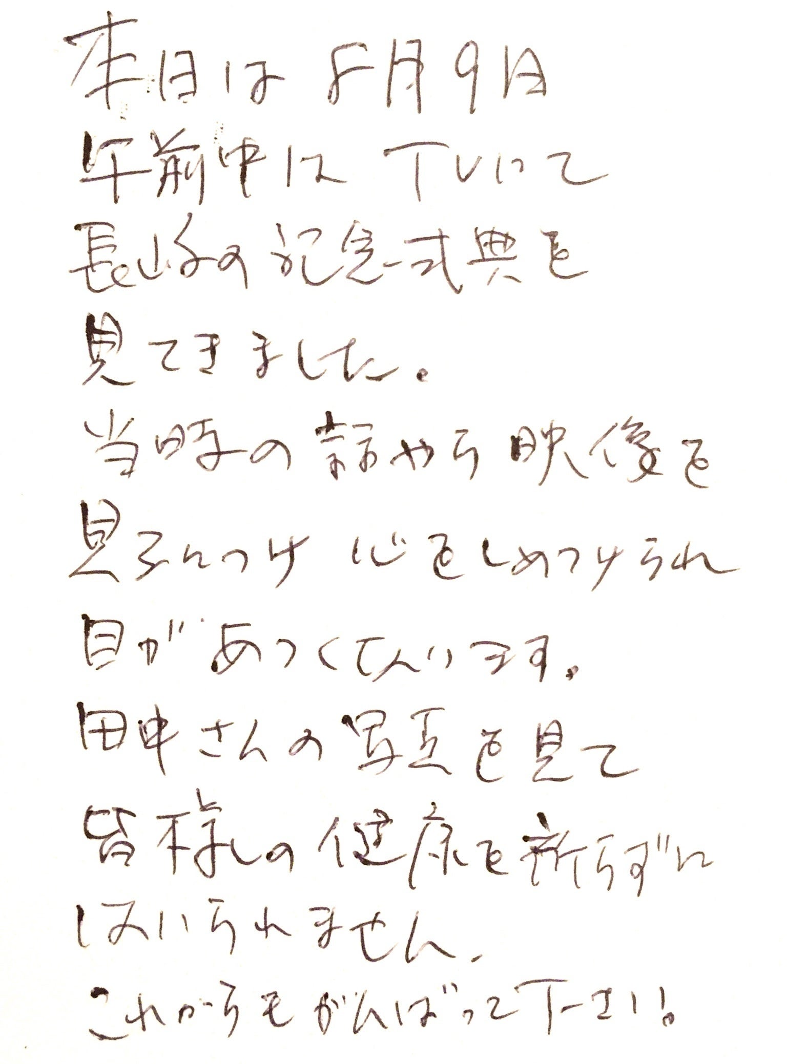 2025/08/09 11:5580年目の長崎原爆の日。皆様思い思いの夏の1日をお過ごしのことでしょう。私の心の中には、12年間見てきた東京で生きる被爆者たちの様々な表情が鮮やかに散らばっています。彼らはこの日をどんな思いで迎えているのでしょう。高齢や病気の進行で故郷の土を踏むことが叶わない人もいます。故郷のことを、あの日のことを、どんな風に心に描いているのでしょうか。毎年、毎年、切なさがぐっと胸にせまってきます。戦後80年という節目の年に、世間では例年より多くの報道がなされたように思います。では81年、82年はどうでしょうか。いずれいなくなる被爆者たち。その事象を止めることはできない私たちに、何ができるでしょうか。AIに解決策や悩みを訊いても、きっと解決にはつながりません。戦争を始めたのも爆弾を落としたのも、すべて人間です。私たち人間は、考え、学び、想像することができる生き物だから。AIに未来を占わせ、悩みまで相談するヘンテコな時代に、人間の尊厳と責任だけは忘れてはならないと思います。ある人が、全国でサイレンが鳴るようになればいいねと呟きました。なりません。あなたがその方法を考え、何かひとつでも行動を起こさなければ、自動的には歴史は変わらないのです。相変わらず、長崎に住んでいる友人のSNSでは8月9日当日も「子どもがどうした」とか、「美味しいものを食べた」とか、そんな投稿しかありません。よい意味でとらえればそれが「平和」ということなのかもしれないですが、焦りも感じます。村上龍の『69』で、学生たちが掲げた「想像力が権力を奪う」という言葉が好きです。怒ること、祈ることを忘れずに、想像力を武器にあらがっていきましょう。クラファンのリターンで活動報告と御礼の小宴を選択された方、本日18時から四ツ谷で開催しますので後ほどお会いしましょう!楽しみにしております。tanama もっと見る