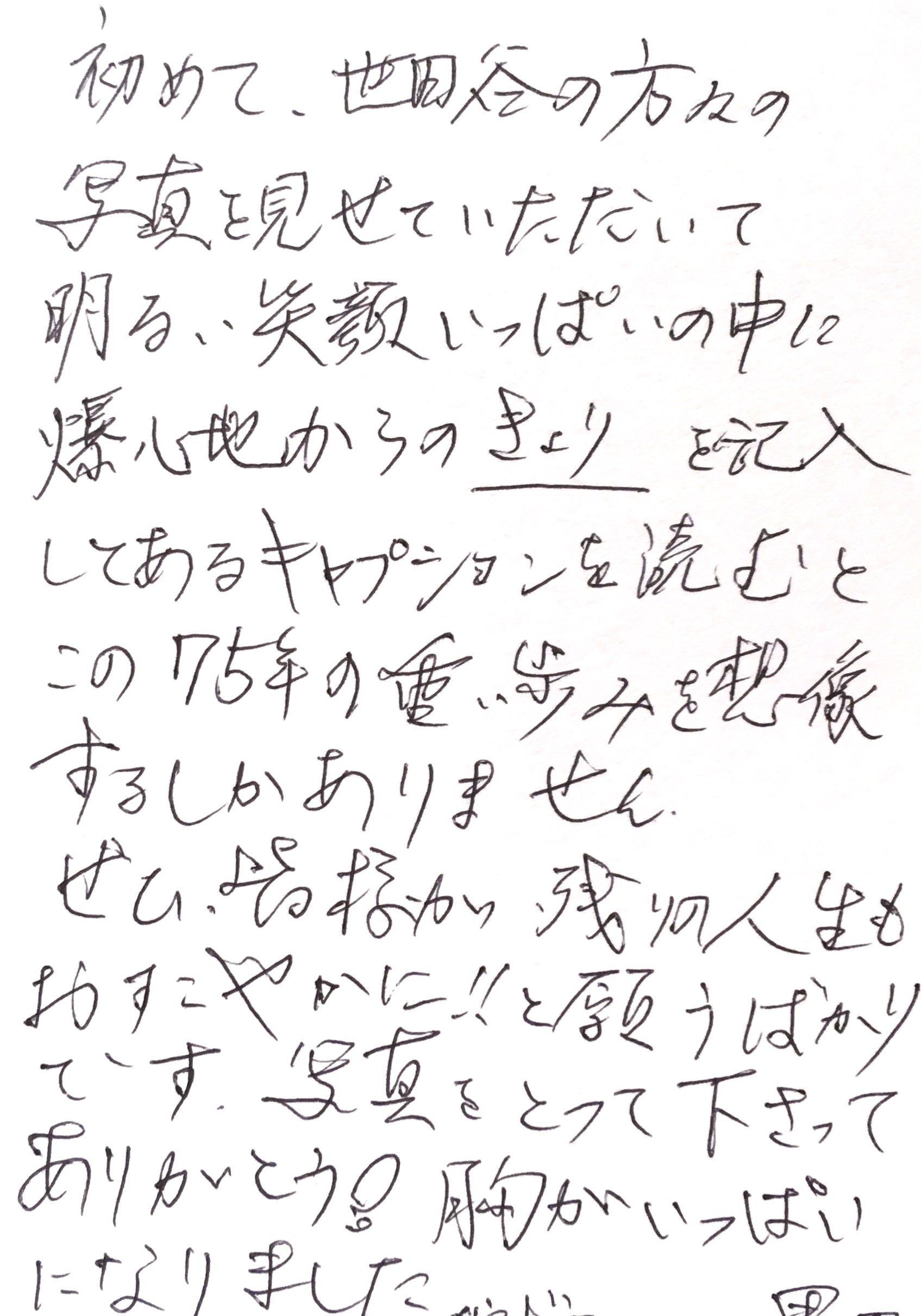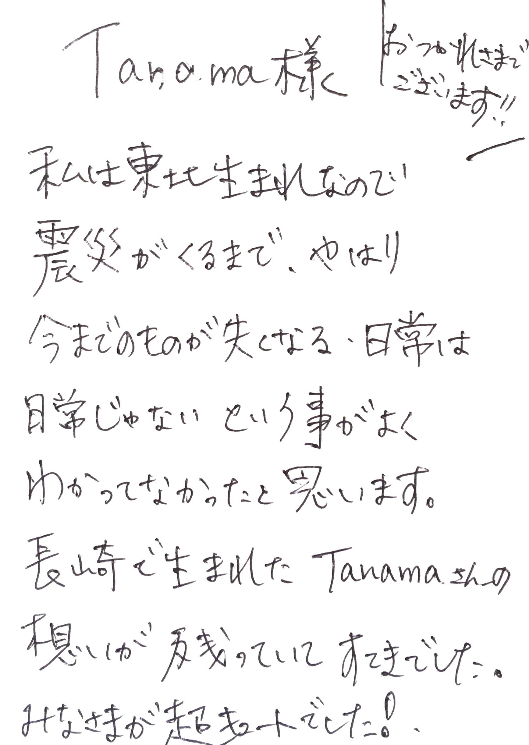 2013年に手探りで始めた被爆者の撮影ですが、個展を開くたびに多くの反響をいただいています。広島、長崎にルーツがある人、親戚に被爆者がいる人、自身が被爆三世だという人、原爆のことを深く考えたことがなかった人、教師として平和活動に関わってきた人、tanamaが何かを頑張って伝えようとしているらしい、と思って足を運んでくれた人・・・