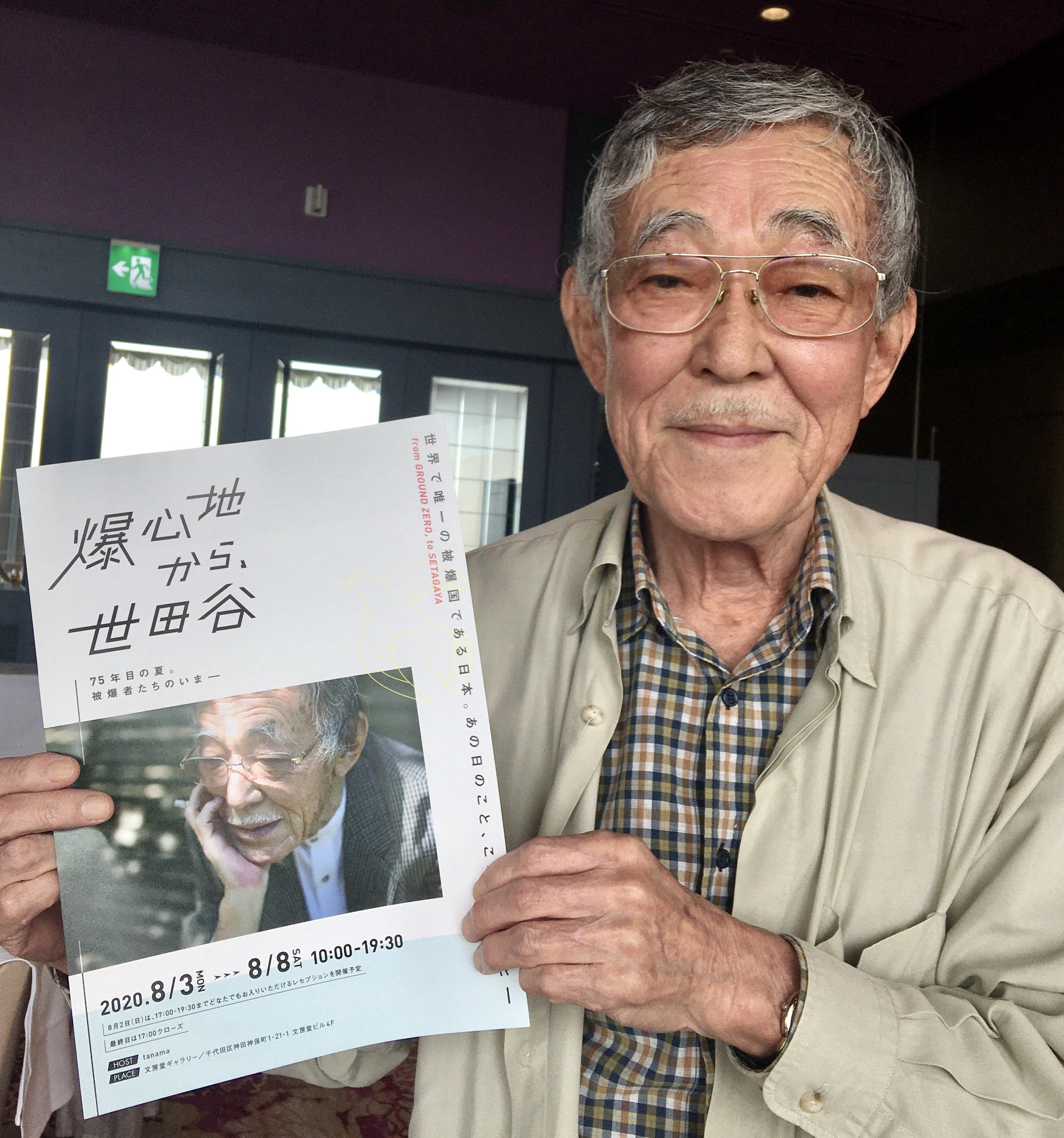 自身がメインビジュアルになったフライヤーを持って微笑む被爆者の松田さん。被爆者の皆さんにも個展の開催を喜んでいただいています