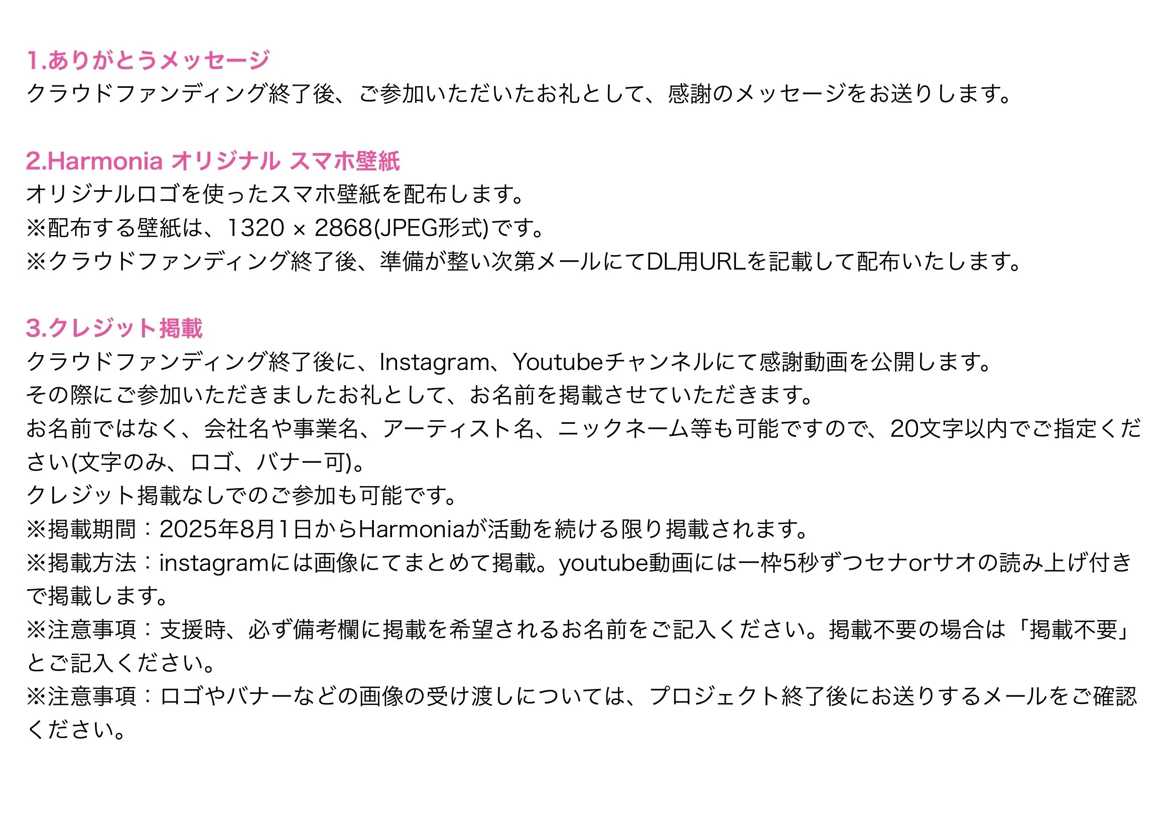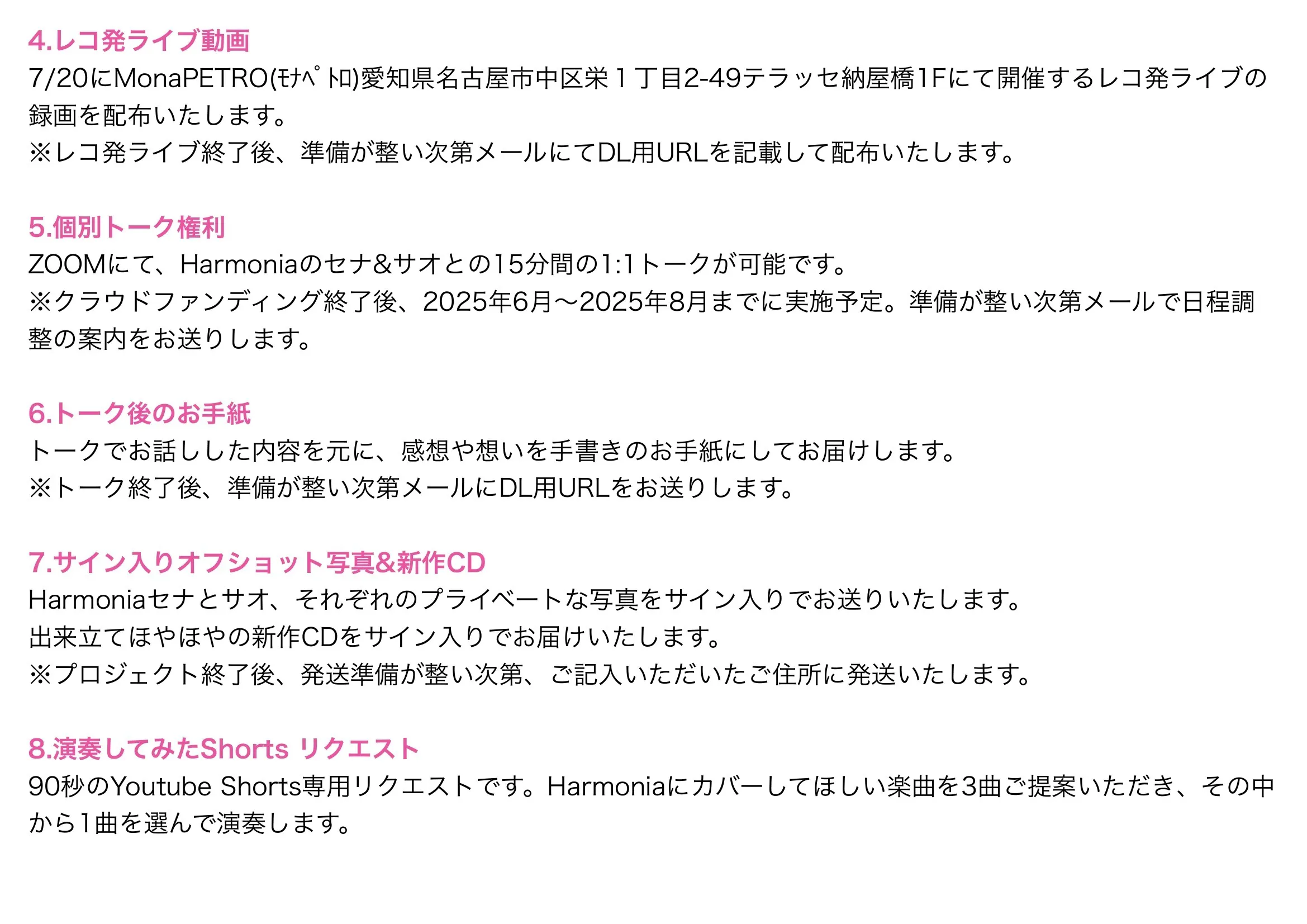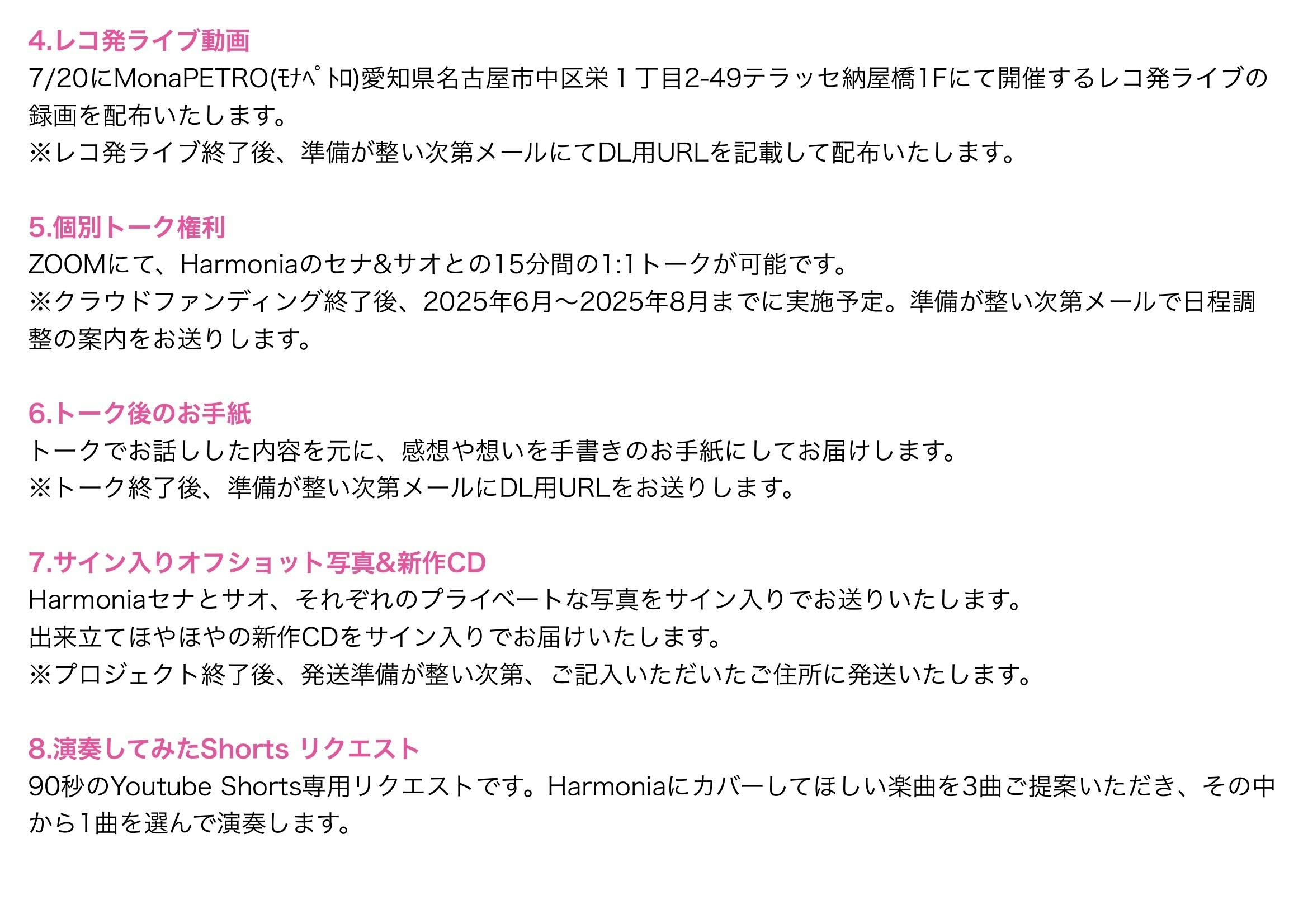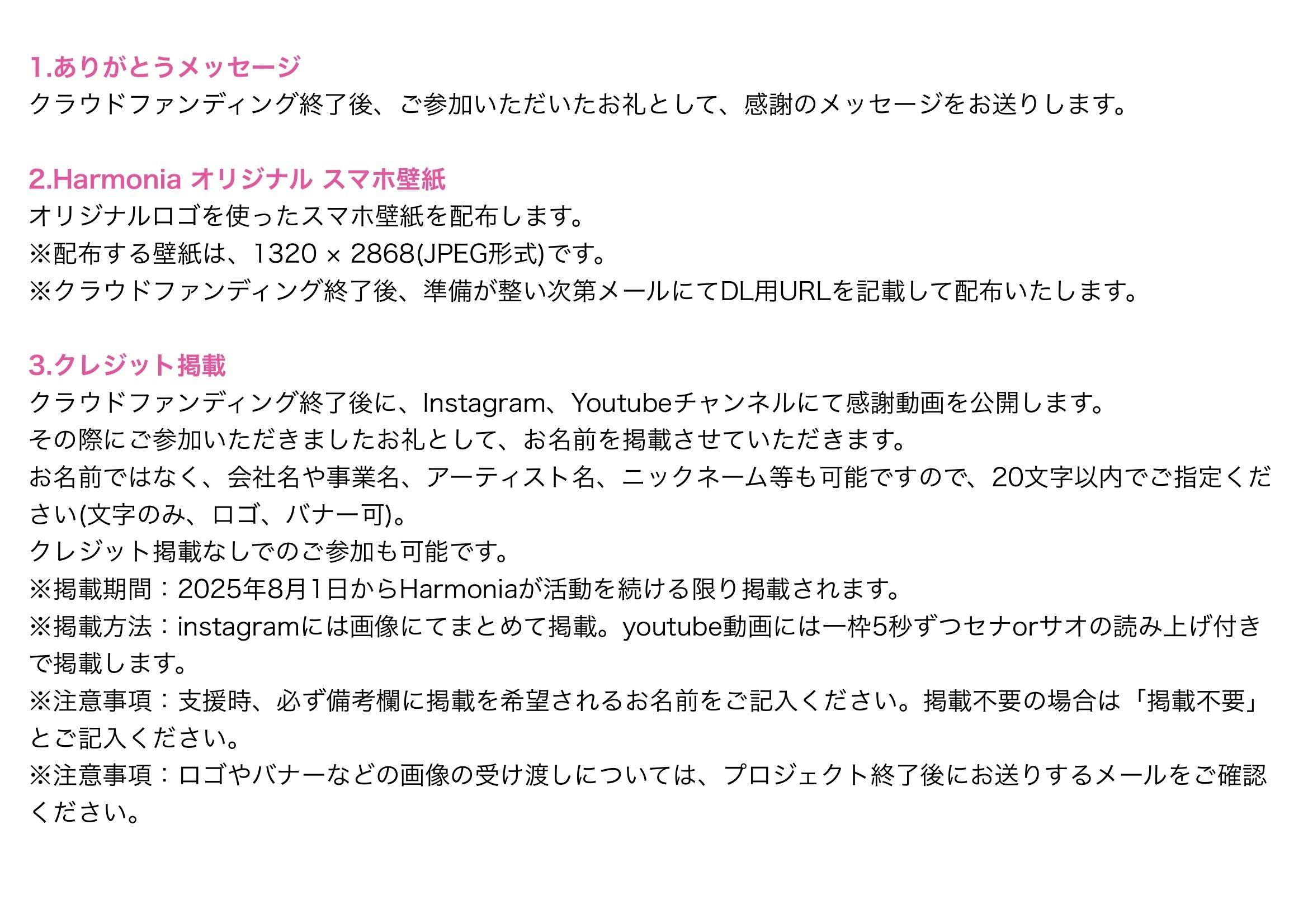 目標金額は、決して簡単に達成できる額ではないですが、Harmoniaの次なるステージへの第一歩としてみなさんにお力添えいただきますと幸いです。みなさんと一緒に、今までにない最高の一枚をリリースしたいと願っています。