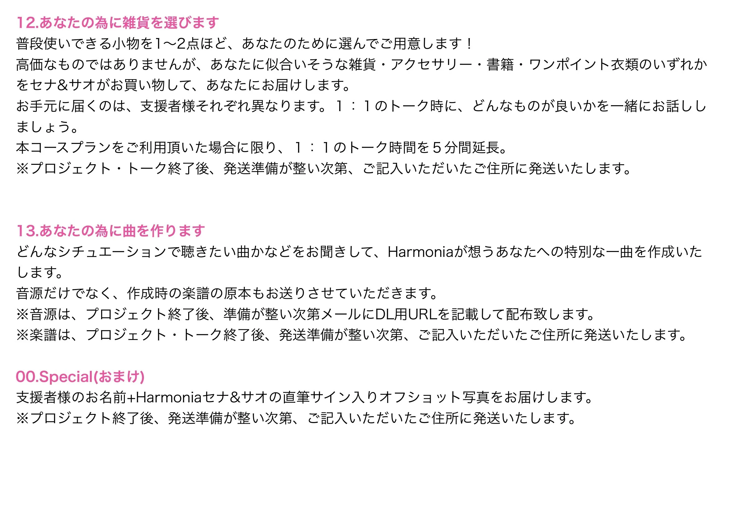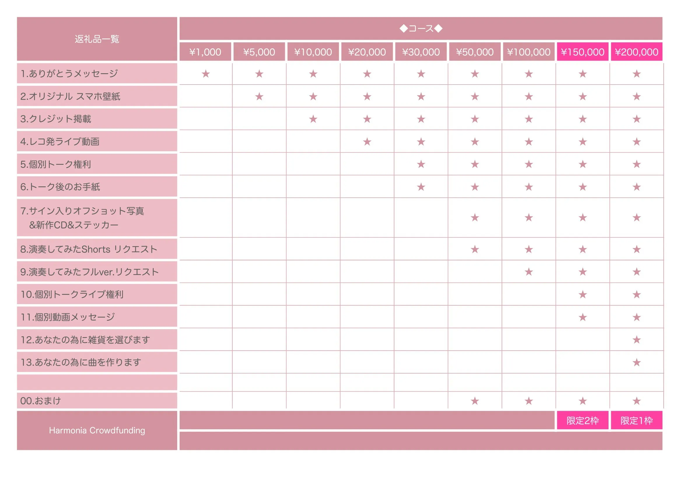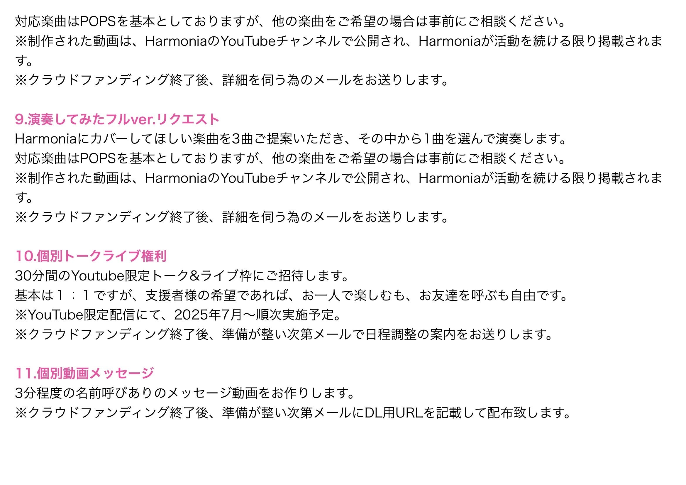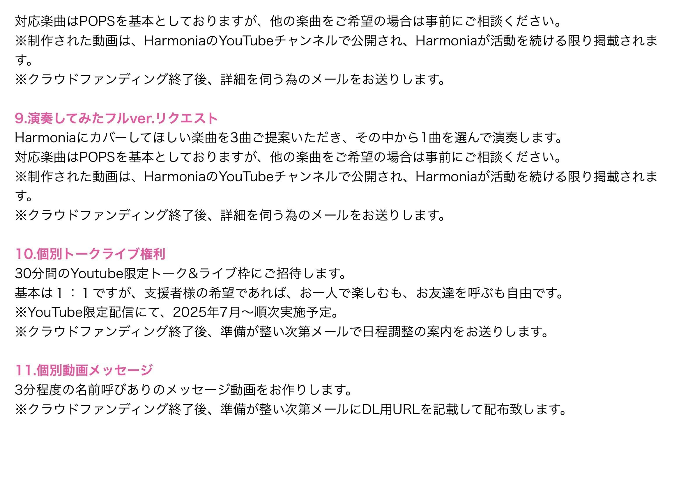 目標金額は、決して簡単に達成できる額ではないですが、Harmoniaの次なるステージへの第一歩としてみなさんにお力添えいただきますと幸いです。みなさんと一緒に、今までにない最高の一枚をリリースしたいと願っています。