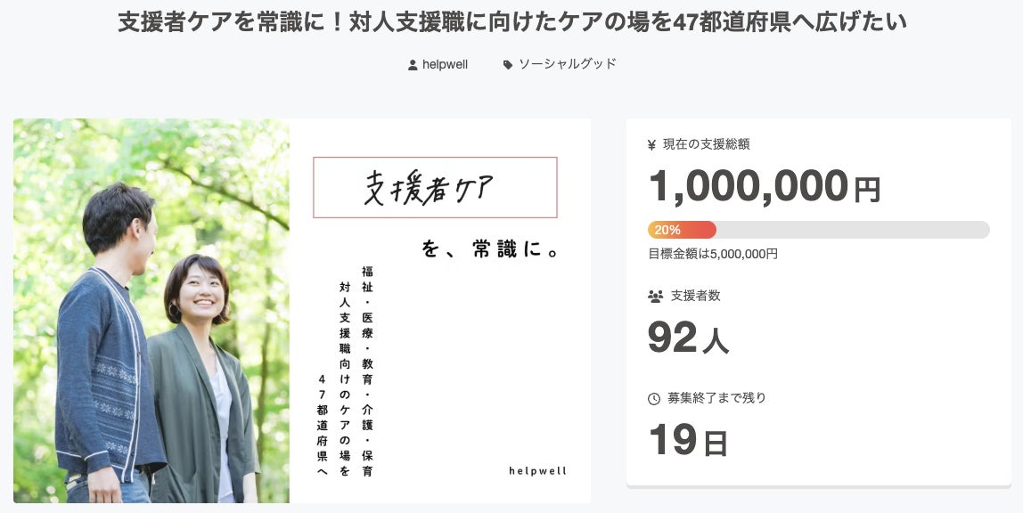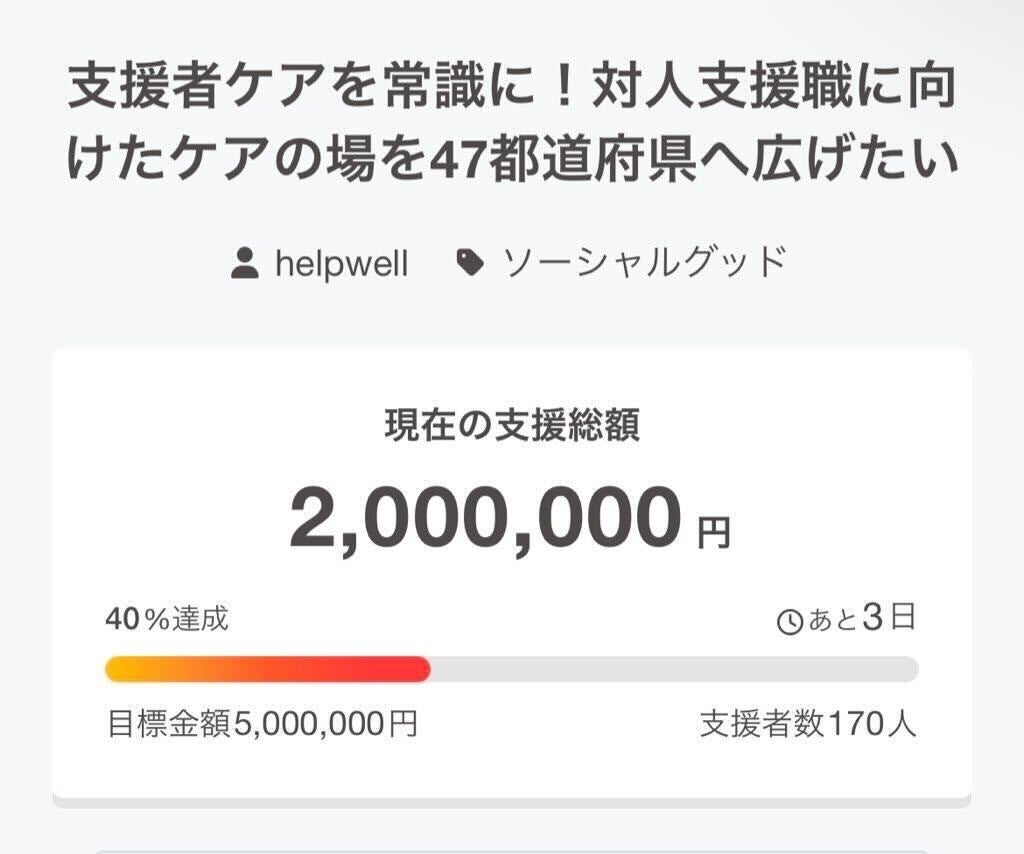 本プロジェクトへご支援くださった皆様へお世話になります。クラウドファンディングへご支援いただき本当にありがとうございました!4月から、皆様のご協力のおかげでhelpwellはNPO法人化することができ、「支援者ケア」の活動は14地域、260名以上の対人支援職へと輪が広がっています。本当に、いつもありがとうございます!今回は新たな仲間募集に向け支援者ケアファシリテーター2期の募集を開始しましたのでご連絡いたしました!今回の講座では、・対人支援職のバーンアウトやセルフケアなど、専門家から多角的に学ぶことができ、・全国50名以上のhelpwellの仲間たちと共に支援者ケアの実践を共有できるような魅力的な内容となりました!ご興味ある方は、以下が詳細ページとなっておりますのでご確認ください☺https://note.com/helpwell/n/nd24e6b5b1be1 今後も支援者ケアに溢れた社会を目指し、活動を続けて参ります。よろしくお願いいたします。NPO法人helpwell 代表理事 櫻田千江里