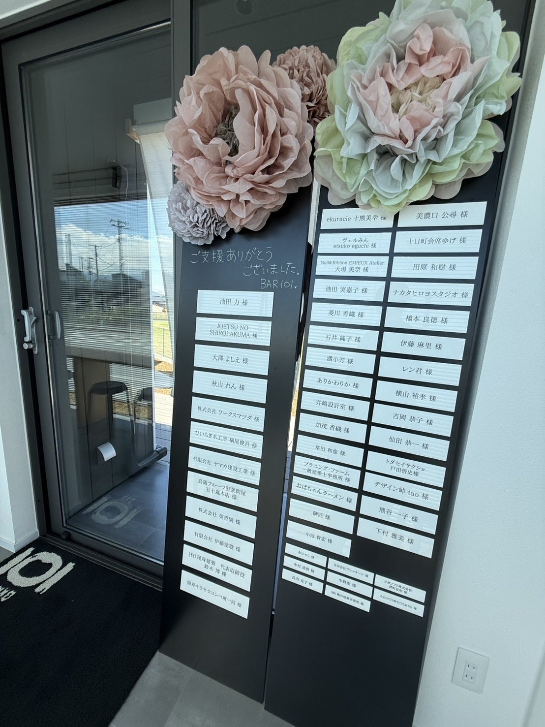 2025/08/01 16:15“お花の代わりに、あなたのお名前を”BAR101の店内に掲出させていただく「スペシャルサンクスボード」が、完成しました!お名前を目にするたびに、たくさんの人に応援していただいていることを改めて感じます。この場を借りて、改めて本当にありがとうございます。オープンに先立ち、ドリンクチケットリターンの返礼なども進んでいます!支援者様はダイレクトメッセージをご確認ください◎支援していただいた皆さんには感謝の気持ちでいっぱいです。ぜひ、お近くに来られた際はお立ち寄りいただき、ご覧になってくださいね!クラウドファンディングは残り2週間、SNSでの拡散も大歓迎です!引き続きよろしくお願いいたします! もっと見る