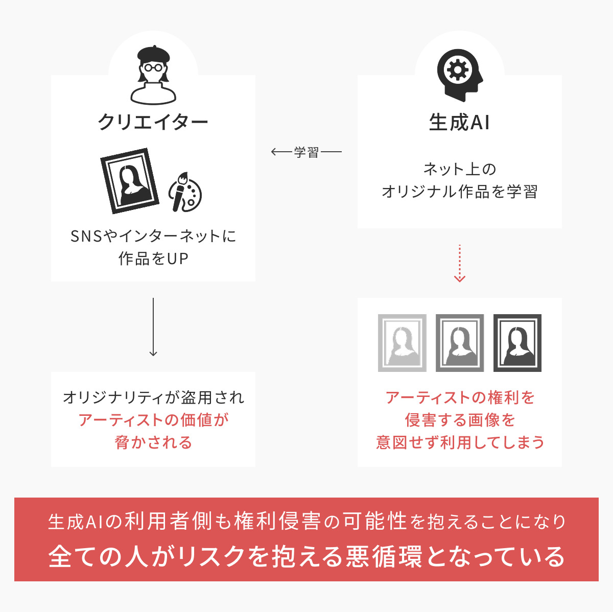 画像生成AIや音楽生成AIにおいては、オリジナルの作品が無断で利用され、その結果、アーティストやクリエイターが経済的損失を被っているという事態が起きています。