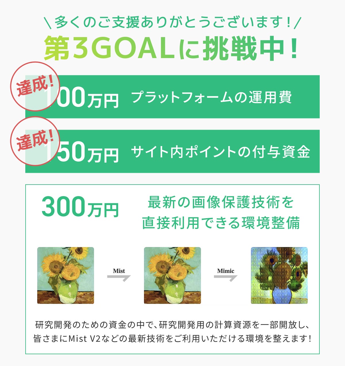 2025/06/16 13:00この度は、クラウドファンディング「アーティスト・クリエイターの権利を保護する学術研究プロジェクト」に多くのご支援を賜り、誠にありがとうございました。本クラウドファンディングは2025年3月13日より募集を開始し、79日間で316名の方々から1,710,000円のご支援をいただき、目標金額の171%を達成することができました。皆さまの温かいご支援に、心より御礼申し上げます。支援金の使途について今回のクラウドファンディングは、本課題に対する研究費の募集ではなく、多くの方が安心して作品を公開できる場を継続的に提供するための運用費の調達を一番の目的としていました。これは、研究者各自が獲得している科研費などの研究費は、研究以外の用途には使用できないことによります。そのため、今回いただいたご支援金は、目標金額を超えた分も含め、全てプラットフォームの運用費に充てさせていただきます。私たちのサービスでは、すべてのユーザー(未ログインの閲覧者を含む)に対して、投稿されたすべてのオリジナル画像について、アクセスされるたびに署名付きURLを毎回発行しています。これらの仕組みにより、機械による画像の収集・解析を困難にしながら、人間の閲覧者にとっては快適な閲覧体験を提供しています。運用には決して安価でないコストがかかりますが、皆さまからのご支援金を大切に活用し、5年、10年と継続的な運営を目指してまいります。リターン実施完了のお知らせご支援への感謝として、掲載をご希望された支援者様のお名前を、特設ページにて掲載させていただいております。リンク先をご確認のうえ、お名前の誤記や記載漏れ等がございましたら、お手数ですが、CAMPFIREのメッセージ機能よりご連絡ください。URL: https://lovlet.jp/supportersクラウドファンディング支援者限定バッジの付与対象者は、ログイン後「設定」ページにて、バッジの表示・非表示を選択いただけるようになっています。対象者で設定項目が表示されない場合も、同様にメッセージ機能よりご連絡ください。URL: https://lovlet.jp/settings最後に今後も、長期的な運用と、技術の進展や状況に応じた適切なアップデートを継続していけるよう努めてまいります。また、サービス内の設定ページから有料会員(月額550円から)としてご登録いただくことで、今後の運用を支える大きな助けとなります。もしご賛同いただけましたら、ぜひこちらからのご支援もご検討いただけますと幸いです。長期的な課題解決に向けて尽力してまいりますので、今後ともどうぞよろしくお願いいたします。Lovletプロジェクトメンバー一同 もっと見る2025年最新の画像保護技術とソースコード