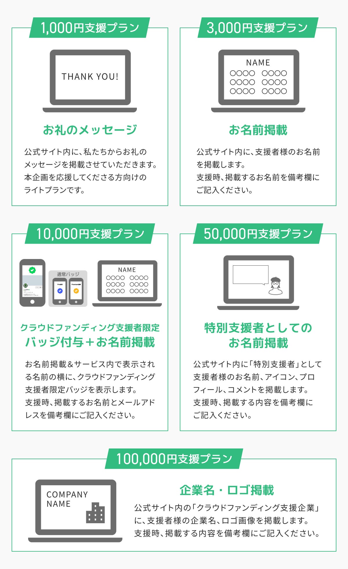 お名前掲載の他、サービス内で表示される名前の横にクラウドファンディング支援者限定バッジを表示します。