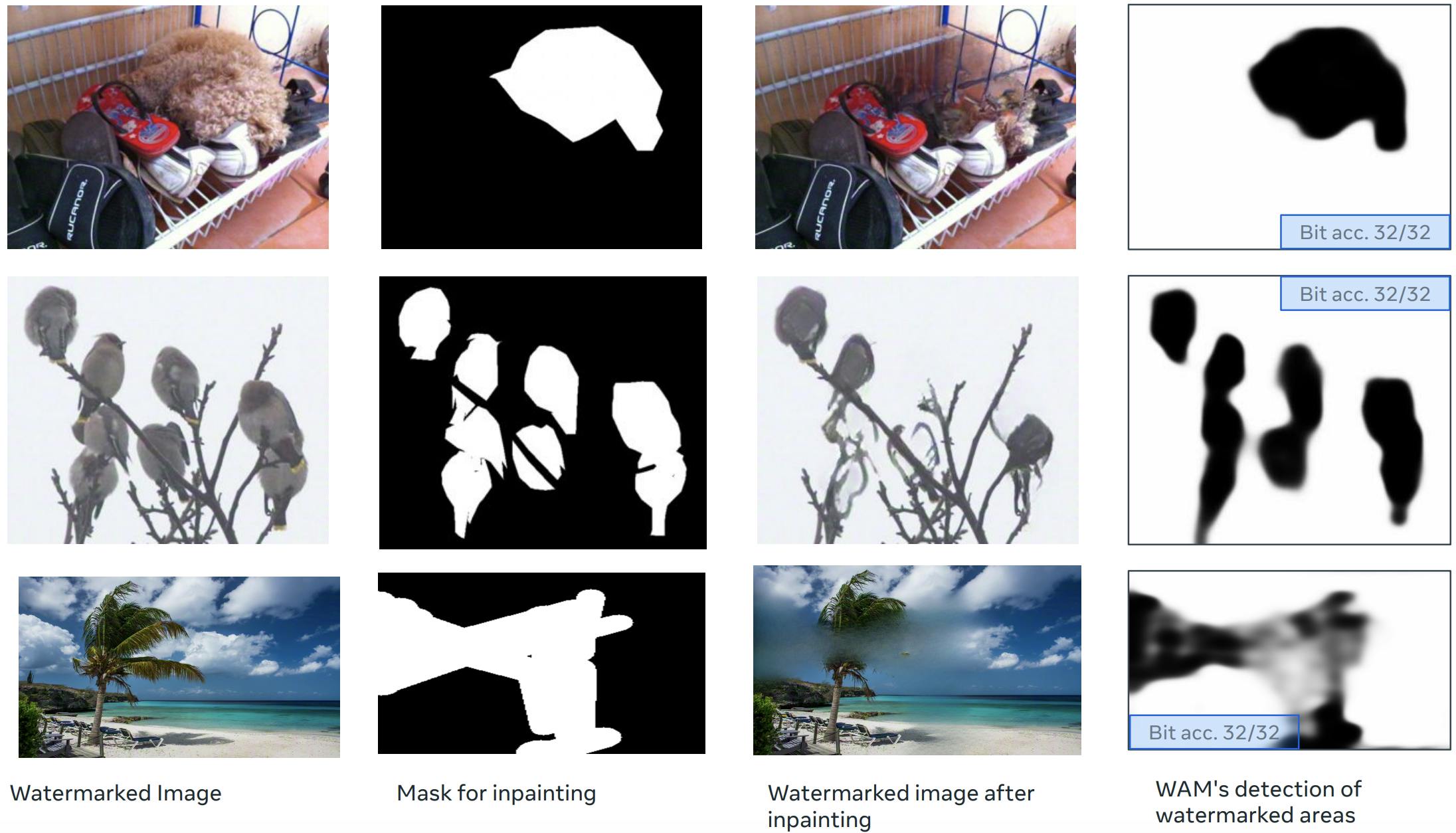 WAMは、Meta社によって提案されたもので、EditGuard同様、画像に目に見えない形で著作権情報を埋め込むだけでなく、改ざんが行われた領域を特定することが可能なウォーターマーキング技術です。