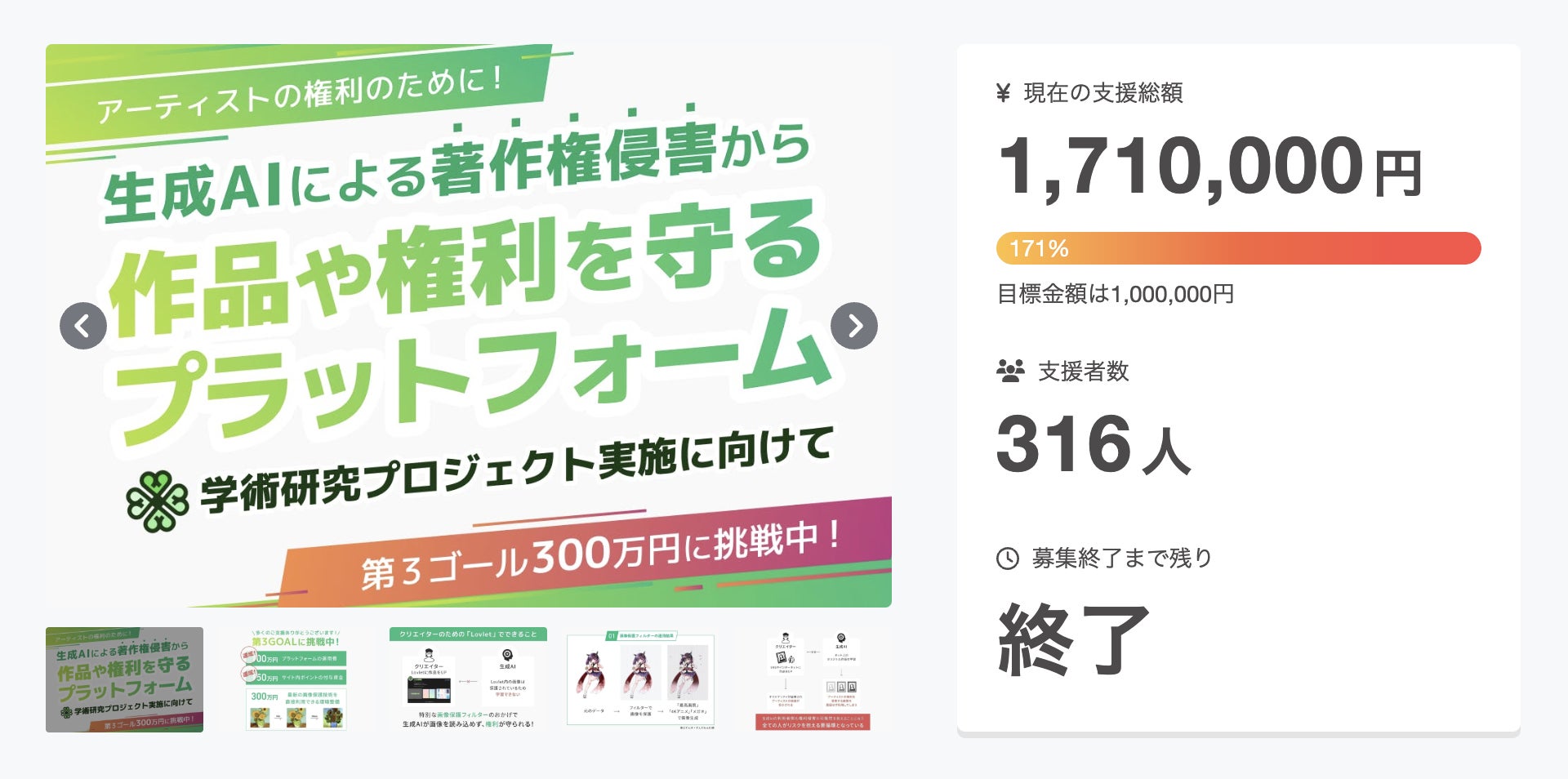 本クラウドファンディングは2025年3月13日より募集を開始し、79日間で316名の方々から1,710,000円のご支援をいただき、目標金額の171%を達成することができました。