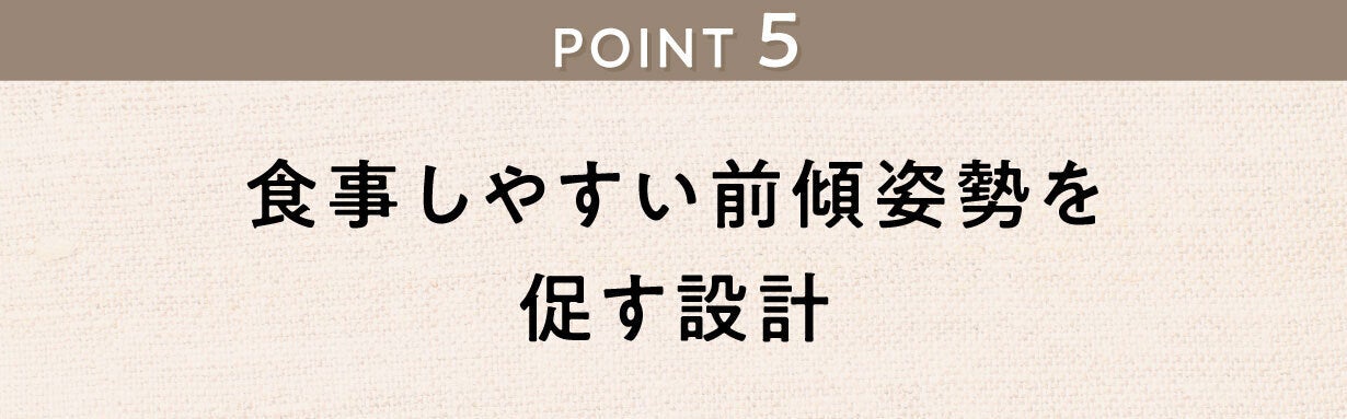 無理に前傾姿勢を取る必要がなく、自然な姿勢のままで楽に食事ができるよう設計されています。