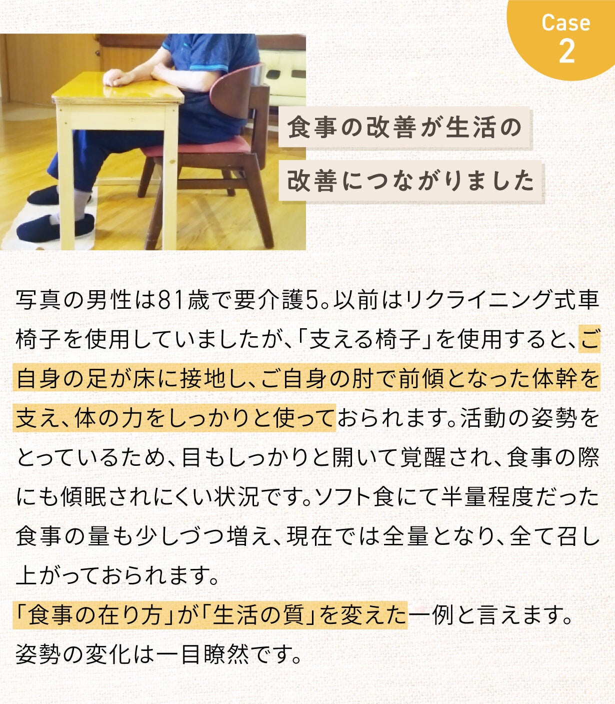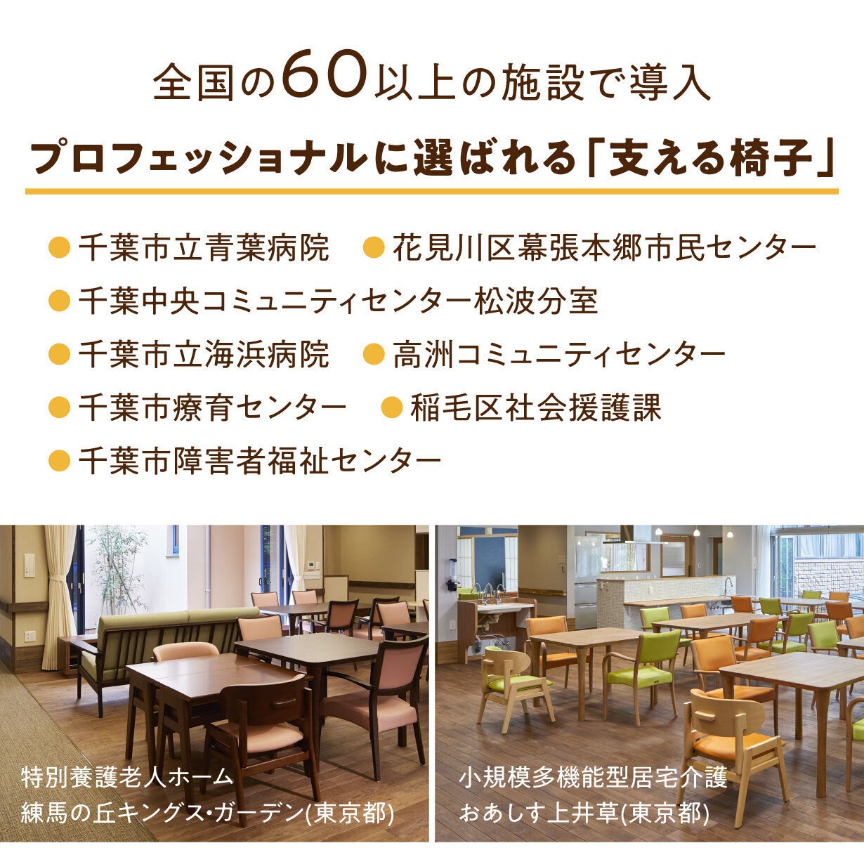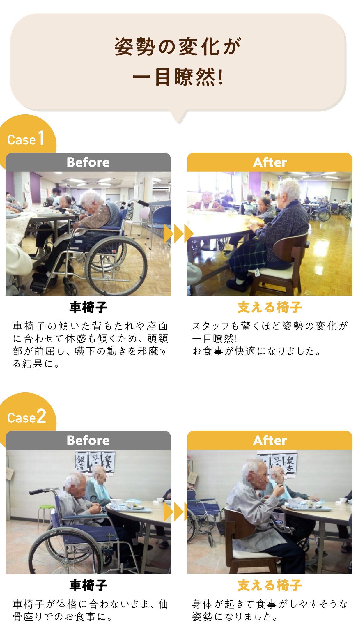 姿勢が崩れるたびに介護スタッフが直す必要があると、負担が増え、食事介助に時間がかかります。支える椅子なら体がずれにくい設計なので、介助の手間が軽減。施設全体の食事時間がスムーズになり、介護の負担を減らします。