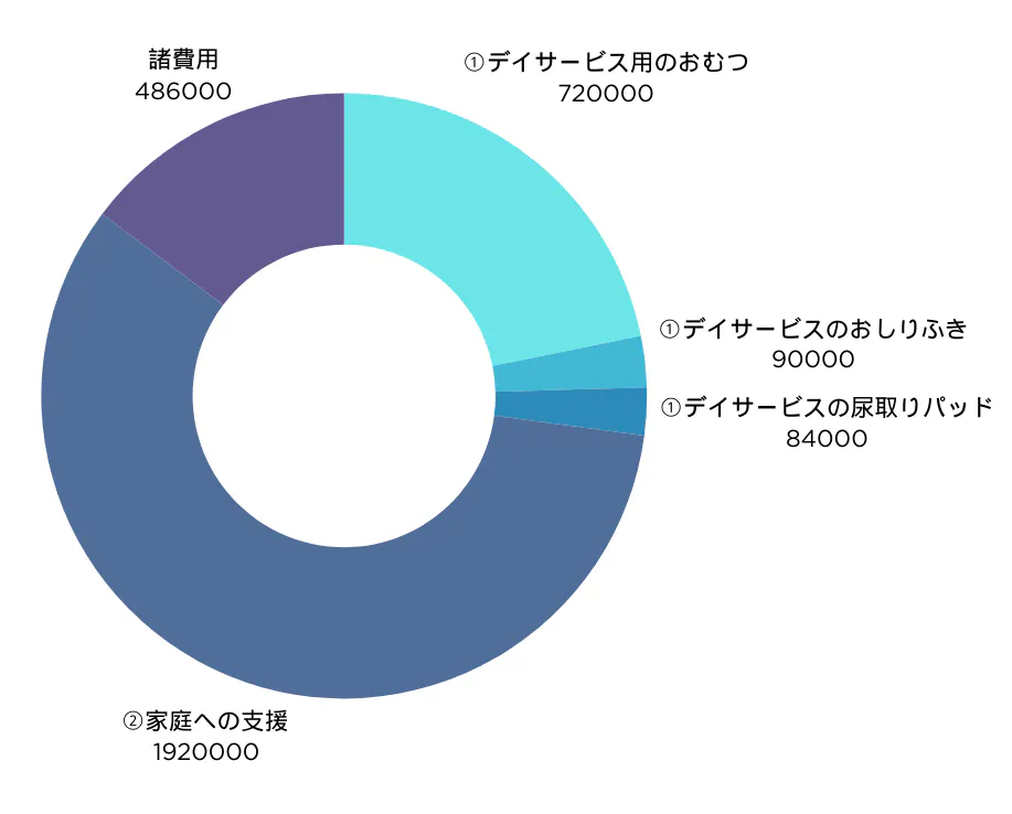 おむつ(1枚100円 × 月600枚 × 12カ月)= 720,000円