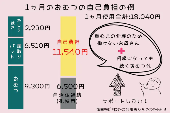 障がいを持つお子さまのいるご家庭では、おむつや尿取りパッドの消費量が多く、家計への負担が大きいのが現実です。