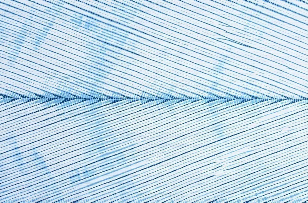 そして、丸太ごと染め上げ、糸を解くと浮かび上がる直線的で繊細な