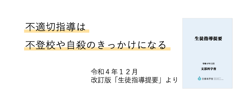 大人の社会ならパワーハラスメントとされるような行為が、学校ではいまだに後を絶ちません。多くの教育関係者や保護者が不適切指導の危険性どころか、不適切指導の存在すら知りません。気付かぬうちに子どもたちが追い詰められ、不登校や自殺が発生しています。